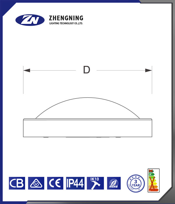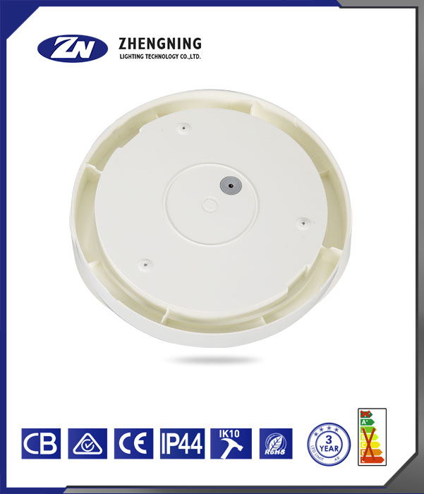 这是正宁照明科技有限公司(ZHENGNING LIGHTING TECHNOLOGY CO., LTD.)生产的灯具。 该灯具整体呈白色圆形,外观简洁。从下方标识可知,它通过了CB、CE等认证;防护等级达到IP44,具备一定的防尘防水能力;抗冲击等级为IK10,能承受较强冲击;符合RoHS标准,较为环保;提供3年的质保期限,且从能效标识来看,能效等级表现较好。