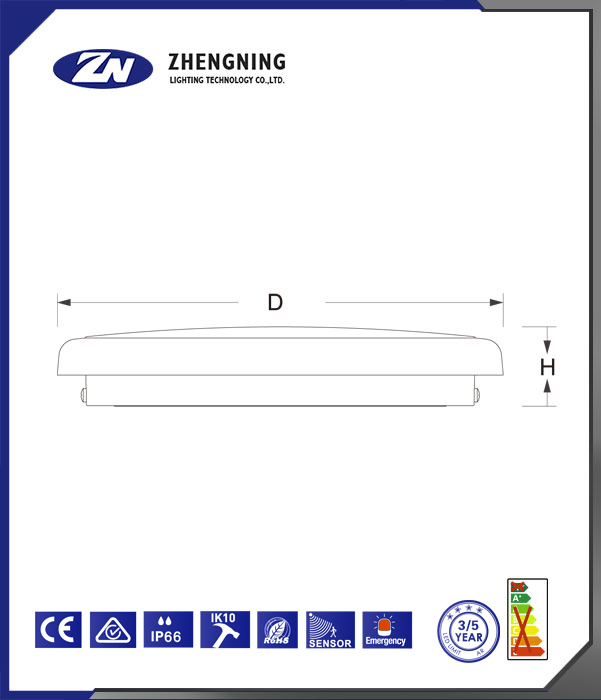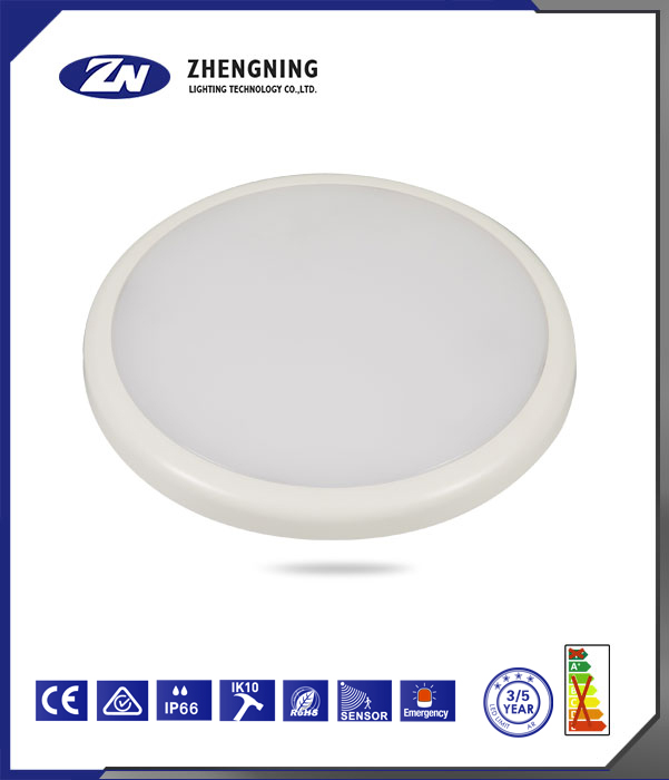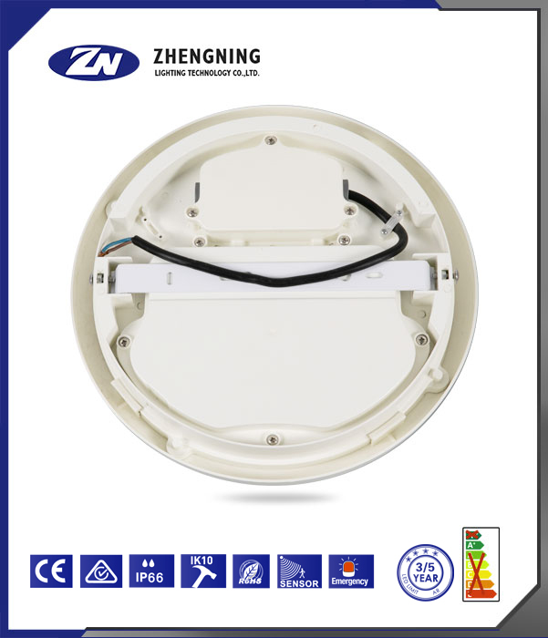 这是正宁照明科技有限公司(ZHENGNING LIGHTING TECHNOLOGY CO., LTD.)生产的灯具。 该灯具整体呈白色圆形,外观简洁。从下方标识可知,它通过了CE认证;防护等级达到IP66,具备出色的防尘防水能力;抗冲击等级为IK10,能承受较强冲击;符合RoHS标准,较为环保;带有传感器(SENSOR),可能具备感应功能,还具备应急(Emergency)功能;提供3到5年的质保期限,且从能效标识来看,能效等级表现较好。