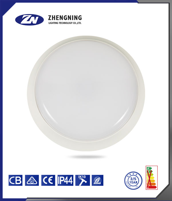 这是正宁照明科技有限公司(ZHENGNING LIGHTING TECHNOLOGY CO., LTD.)生产的灯具。 该灯具整体呈白色圆形,外观简洁。从下方标识可知,它通过了CB、CE等认证;防护等级达到IP44,具备一定的防尘防水能力;抗冲击等级为IK10,能承受较强冲击;符合RoHS标准,较为环保;提供3到5年的质保期限,且从能效标识来看,能效等级表现较好。