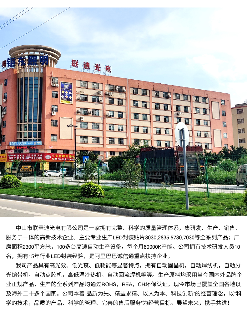 中山市联圣迪光电有限公司是一家拥有完整、科学的质量管理体系,集研发、生产、销售、服务于一体的高新技术企业。主要专业生产LED封装贴片3030,2835,5730,7030等全系列产品;厂房面积2300平方米,100多台全进口高速自动生产设备,每个月80000K产能。公司拥有技术研发人员10名,拥有15年行业LED封装经验,是阿里巴巴诚信通重点扶持企业。我司产品具有高光效、长寿命、低光衰、低耗能等显著特点,从国外引进最先进的自动固晶机,自动焊线机,自动分光编带机,自动点胶机,高低温冷热机,自动回流焊机等等。生产原料均采用当今国内外知名企业正规产品,生产的全系列产品均通过ROHS,REA,CH环保认证。现今市场已覆盖全国各地以及海外二十多个国家。公司本着“品质第一、精益求精、以人为本、科技创新”的经营理念,以“先进的技术,优质的产品、科学的管理、完善的售后服务”为经营目标。