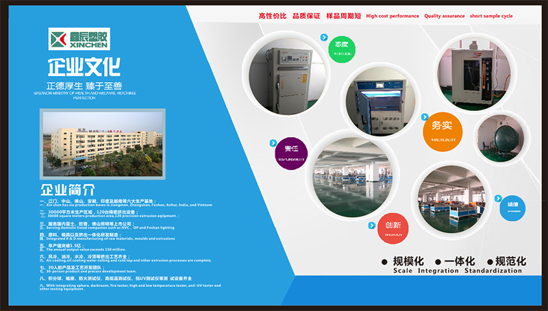 江门市鑫辰塑料电子科技有限公司成立于2014年,深耕照明行业,在挤出制造领域优势显著。目前,公司已形成国内外产业布局,在惠州、嘉兴、江门及越南建有6大生产基地,120名专业团队协作,3万平厂区配备120台精密挤出机,涵盖风冷、油冷等工艺。 我们整合原材料采购、模具制造及生产全流程,30人研发团队结合专业检测设备,严控品质。凭借过硬产品与服务,获雷士欧普、佛山照明等知名企业认可,年产值超 1.5亿元。提供 OEM及定制服务,产品远销北美、欧洲、中东、印度及东南亚等地区。