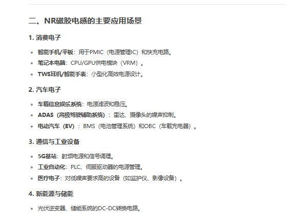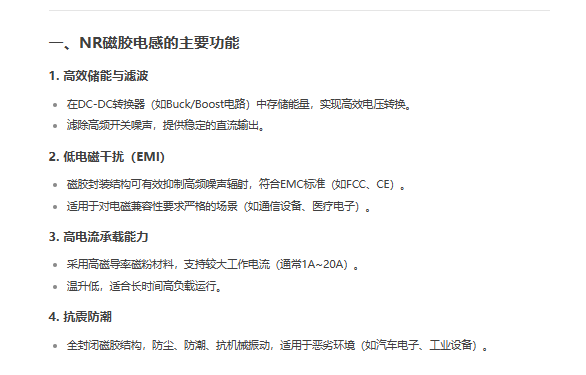 NR磁胶电感是一种采用磁性胶水(树脂混合磁粉)封装的功率电感,具有高密度、低EMI、高可靠性等特点,广泛应用于需要高稳定性和抗干扰能力的电子电路中。