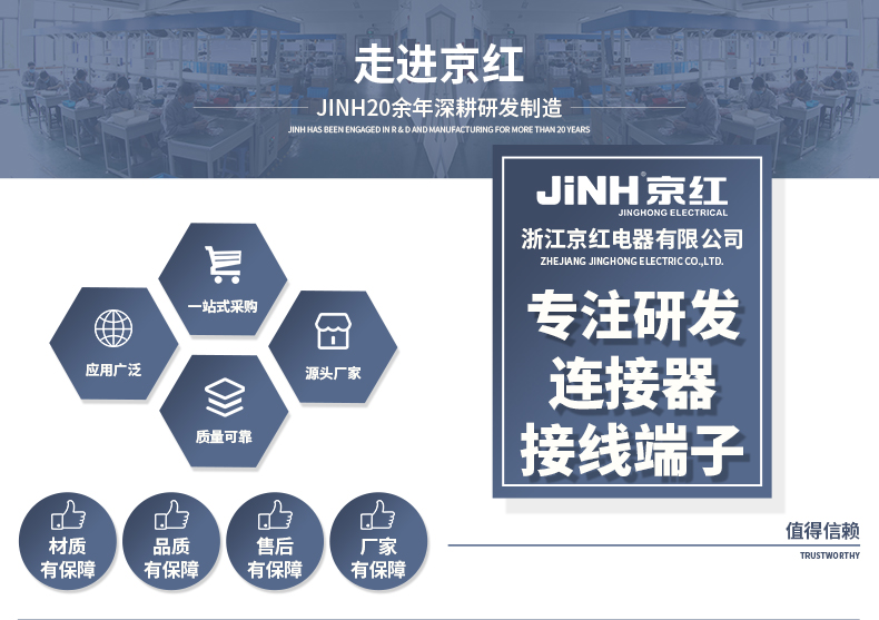 浙江京红电器有限公司创建于1997年,是一家专业从事生产电气连接器、高低压电器辅件企业。公司先进的生产设备和齐全的检测设备,是一家集制造、研发、贸易、服务为一体的高新科技企业。产品通过了TUV、CE、ROHS、 SASO、EAC、CQC 等认证,其中多项产品获国家发明专利。公司已通过ISO9001-2008质量管理理体系认证,并获得企业自主经营进出口权资格。  京红公司主要生产接线端子、接线盒、工业插座、绝缘护套、穿刺线夹、冷压端子及各种电器辅件产品。公司现拥有1000多种不同规格产品,产品远销中国、英国,意大利、西班牙、波兰、俄罗斯、印度、土耳其、巴西、韩国、南非…等60多个国家和地区,为全球工业自动化、照明、 电力电气、仪器仪表、新能源、通讯、 等行业,提供优良的产品和服务.  20年来京红本着“务实诚信、安全稳定、科技创新、精心铸造”的经营宗旨,坚持以质量优异,性能先进的产品满足不断变化的市场需求。使公司在长期与客户合作中得到了一致的好评,广大客户也一致认可本公司产品连接器安全快捷、质量可靠,是值得您信赖和合作的一家公司。