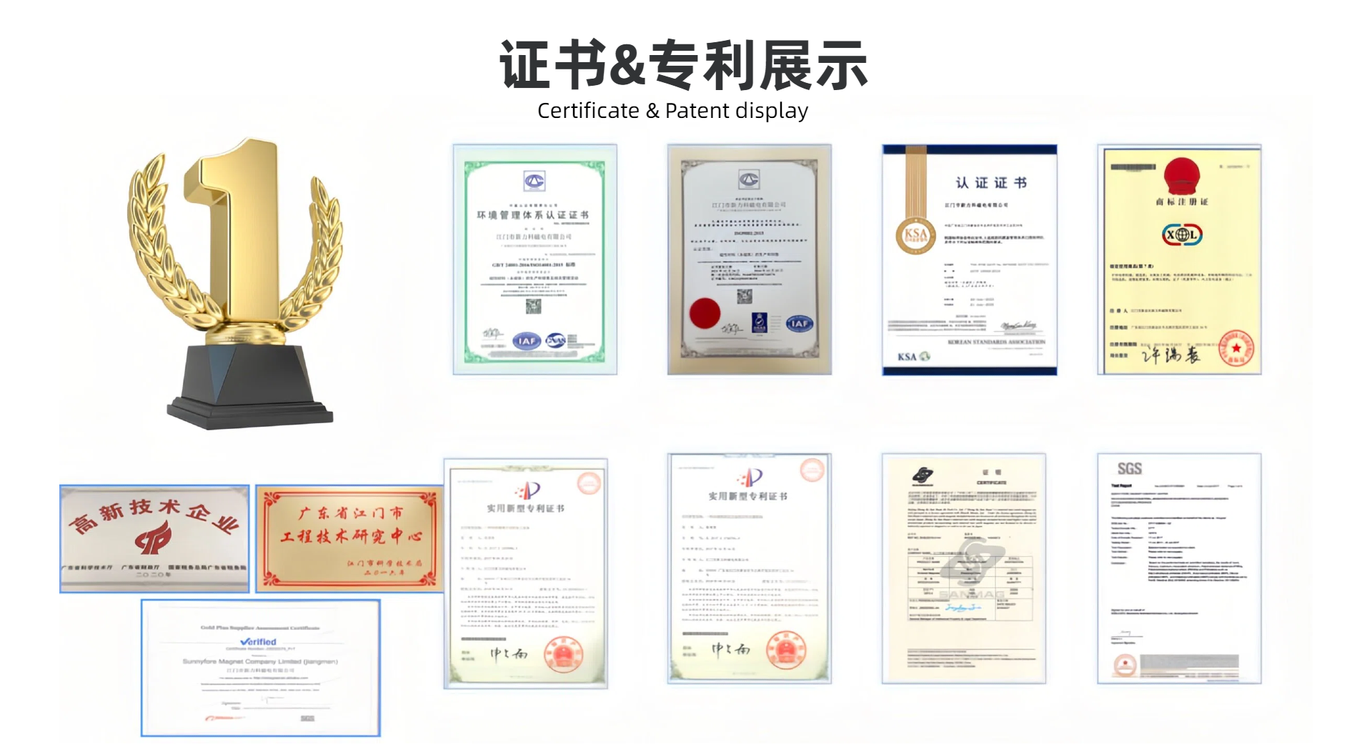 新力科磁电有限公司创建于2000年。位于中国广东省大湾区新兴的制造业基地——江门市。距离深圳、香港等出口港口近。公司成立近20年来,不断创新改革,始终专业从事磁性材料产品的研发和生产 目前,我司主导产品有烧结钕铁硼磁铁,粘结钕铁硼磁铁,注塑磁,和烧结铁氧体永磁等。广泛应用于新能源汽车,伺服电机,玩具磁,智能机器人,3C消费电子,机电,仪器,仪表医疗技术及其他需要永磁铁的装置和设备中。 新力科磁电有限公司具备先进的生产设备和检测仪器,拥有一支强大的研发和技术队伍,顺利通过IS09001:2015质量体系认证和IS04001:2015环境管理体系认证以及IATF16949认证,还通过了RoHS,REACH,SGS,ISO等认证,并被认定为广东省高新技术企业和科技型企业。展望未来,新力科磁电有限公司秉承顾客至上、品质第一、精细管理、持续改进的质量方针和经营理念,为广大客户提供具有竞争力的产品。