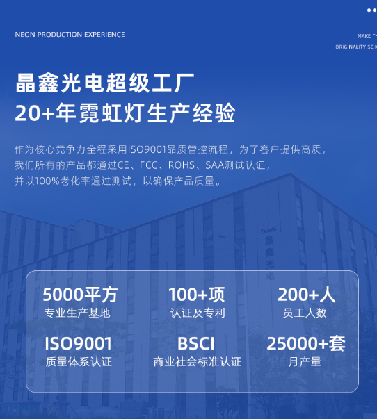 中山市晶鑫光电有限公司,公司成立于2006年,是国内第一批经过ISO9001质量管理体系认证的拥有独立产业链的专业霓虹灯制造商。现有员工150余人,工厂占地面积5000平方米。拥有专用生产设备20余台,专业生产线20条,月产值高达100万至500万美元。公司主要产品包括LED霓虹灯、LED霓虹灯灯带、家居及派对装饰灯等LED系列产品。我们所有的产品都通过CE、FCC、ROHS、SAA测试认证,并以100%老化率通过测试,以确保产品质量。此外,我们拥有强大的设计、技术研发团队,使我们能为客户提供定制方案服务,及承接OEM, ODM等项目。凭借超过17年的国际业务经验,晶鑫光电已经服务超5000余家客户,完成超10,000+个标识项目。我们出口到40多个国家,包括美国,欧洲,波兰,塞尔维亚,土耳其,俄罗斯,墨西哥,印度,泰国,中东和南非等国家及地区。