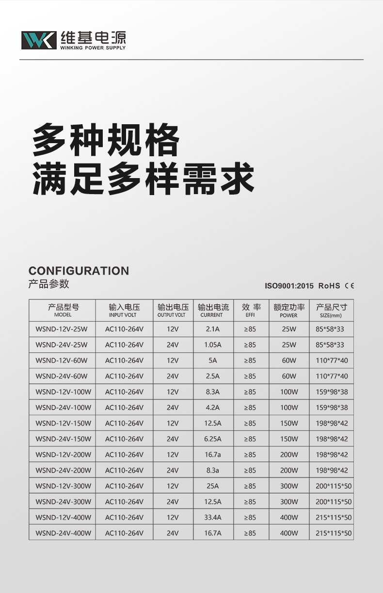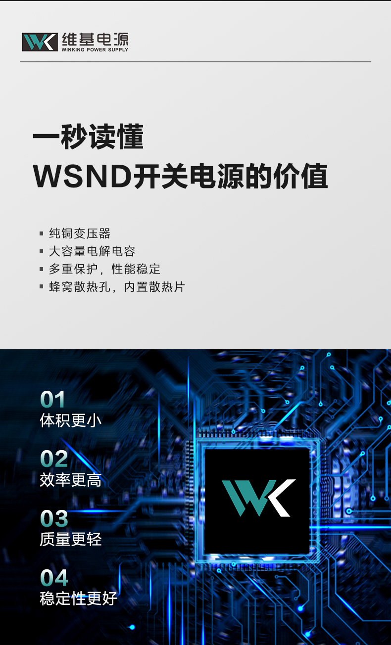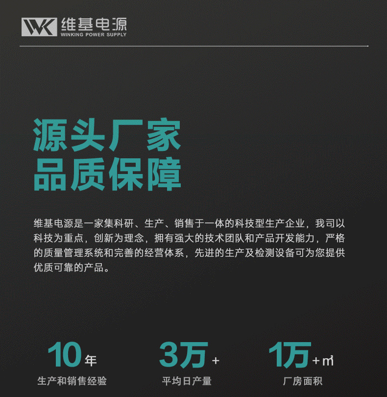 广东维基科技有限公司是集电源、开关电源于一体的研发、生产、销售的科技型企业.公司主营产品包含:电源,开关电源,LED电源,LED驱动电源,防水电源,防雨电源,LED超薄电源,3D打印机电源,橱柜电源,灯箱电源,显示屏电源,普通室内电源等.产品广泛用于LED照明、LED显示屏、安防监控设备、工业自控系统等多领域