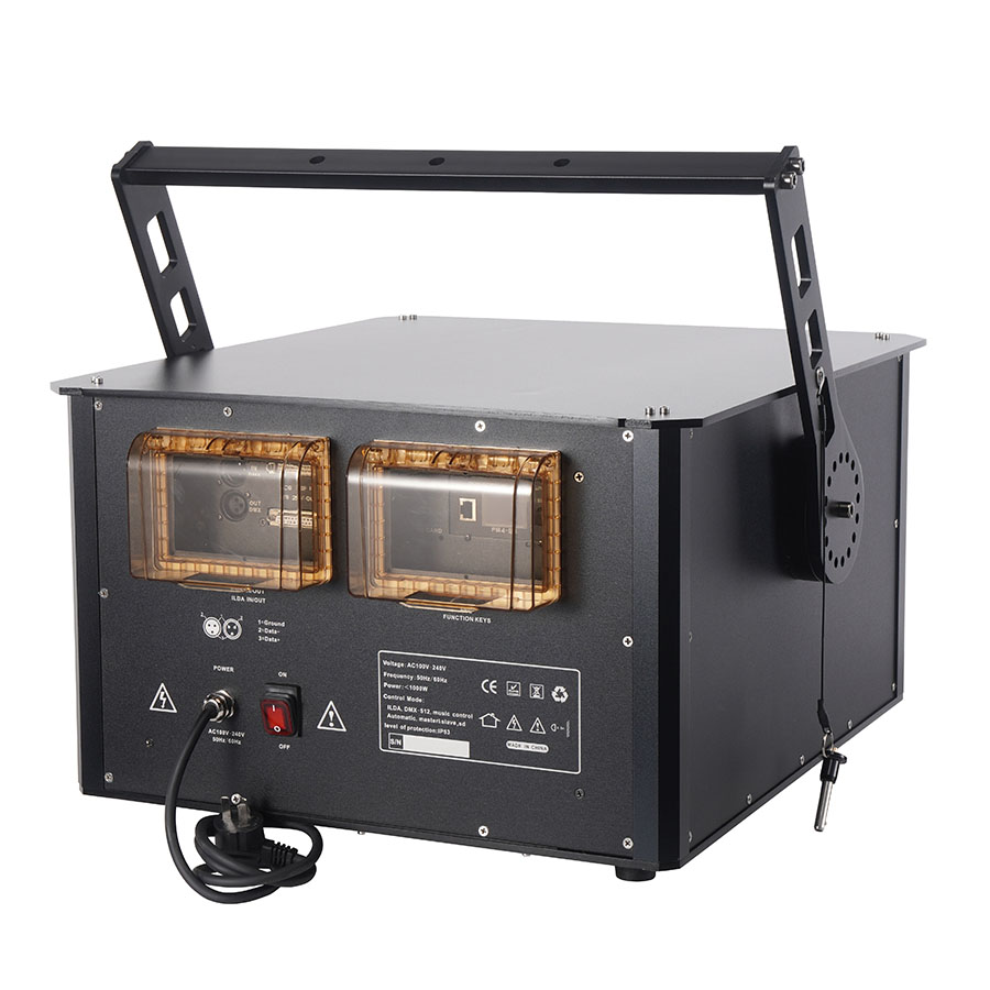 ◆安全智能:无信号闭光、DMX信号及PC信号可切换。带一束光保护功能,如出现振镜故障,只出一束光时会自己闭光。