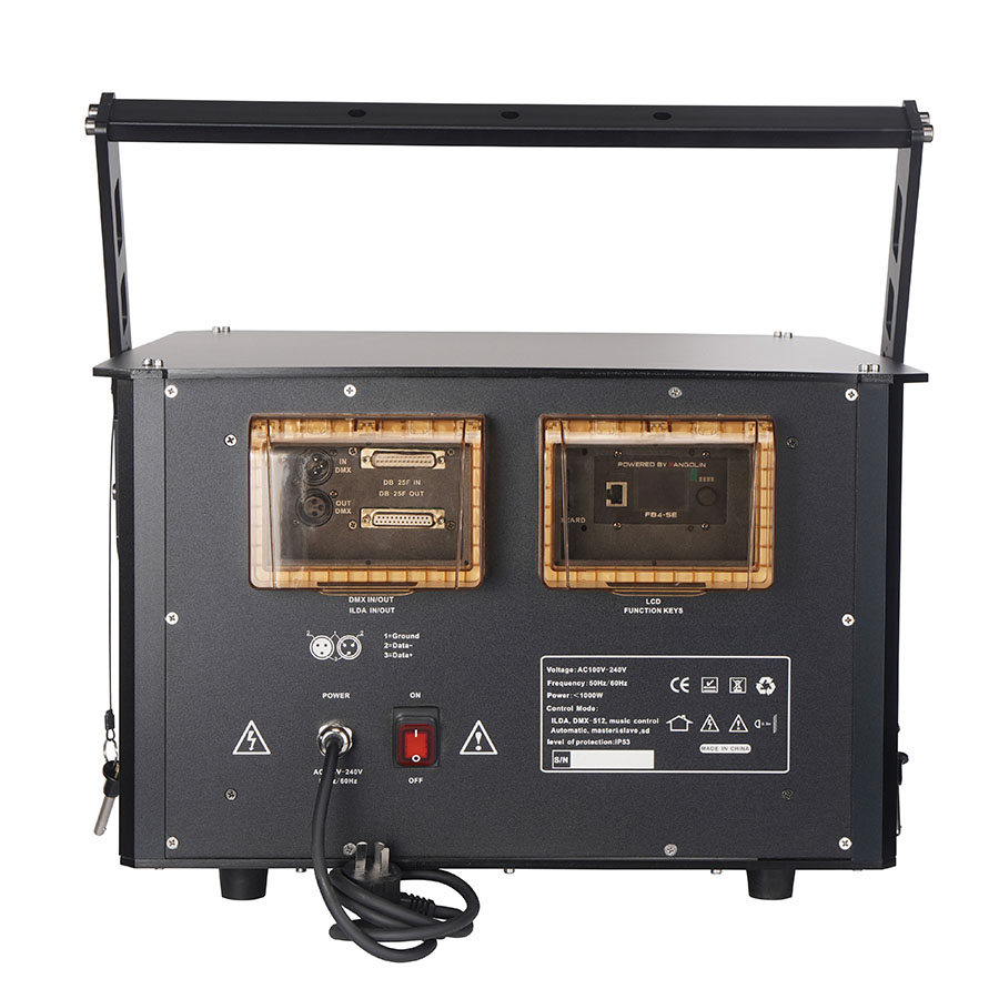 ◆控制接口:国际ILDA DB25接口和RJ45网线接口,可连接美国穿山甲(Pangolin)等通用激光软件,国际通用DMX512接口。
