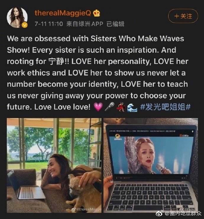 我说《浪姐》火遍全球可不只是个形容词而已,好几个国外客户聊天时提起这个节目,一个俄罗斯客户说他太太非常喜欢这个节目,另外一个泰国客户还发给我们看他女儿模仿万茜跳舞的视频。最最厉害的是,美籍混血影星Maggie Q 也在社媒表白宁静,为《浪姐》打call。