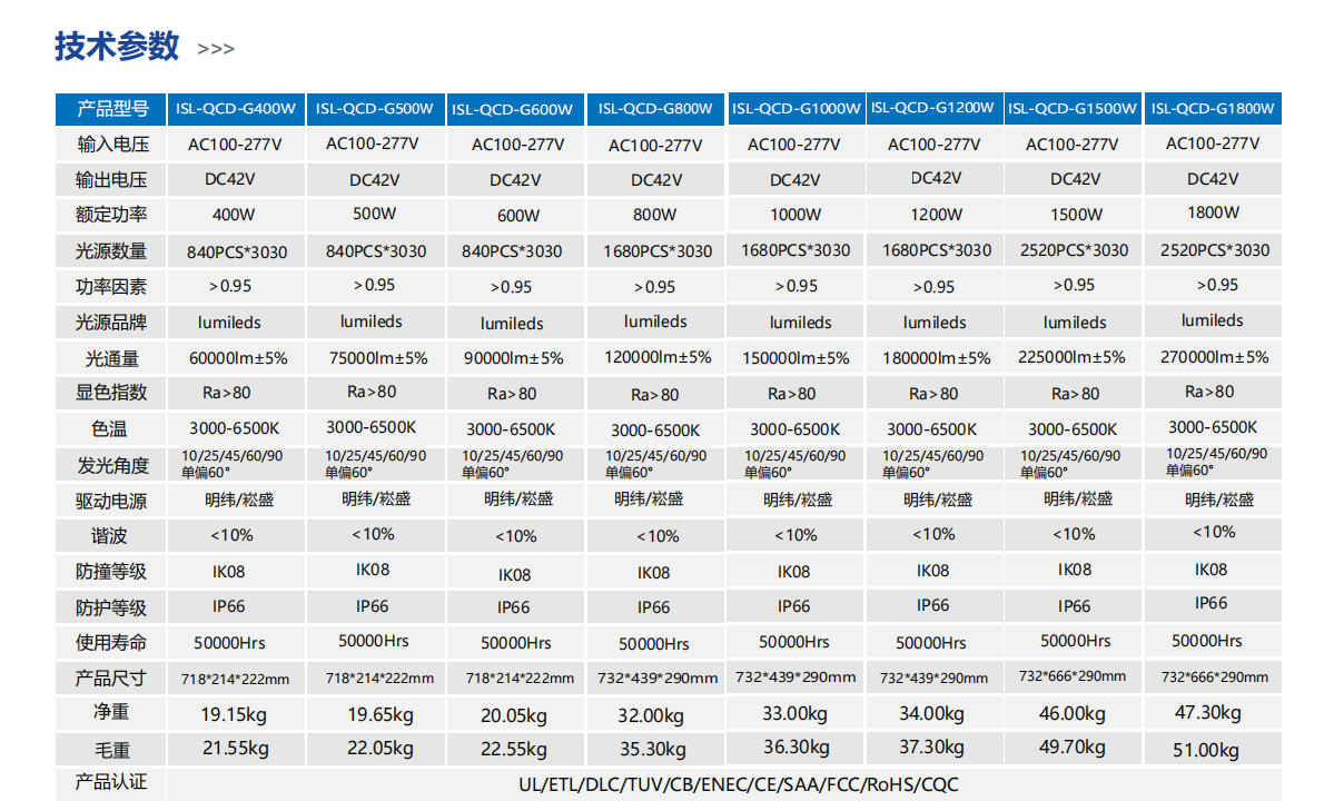 技术参数:采用进口Lumileds/OSRAM光源,高亮度、低光衰、寿命长采用国际一线品牌驱动,具有过温保护、高转换效率、高功率因素、高防雷等特点(1-10V,DALI2.0)采用ADC12压铸成型,具有高导热性能,使热量快速导出体外,平衡灯体内外温度,减小温差,降低光源结温,减少光源光衰采用光学PC透镜,IK08防撞等级,抗UV,透光率94%,专业光学配光:10°、25°、45°、60°、90°、单偏60° 支架安装,工作环境:-35℃~+50℃