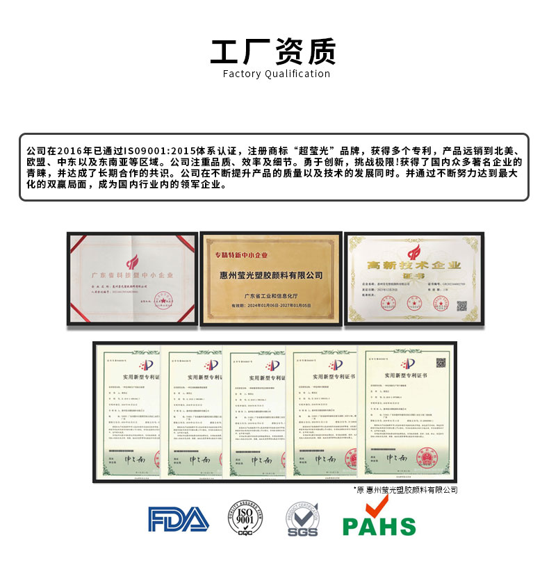 惠州莹光新材料有限公司是一家集生产研发销售为一体的企业,主营产品有夜光粉,荧光增白剂,光扩散材料,研发制造各种色母粒及塑胶配色制造色粉,原材料符合环保要求;公司在2016年已通过ISO9001:2015体系认证及 UL产品认证,注册商标;超莹光品牌,产品广泛应用于塑胶,硅胶,汽车,电子,光学板材,日用物品,油漆油墨及涂料等各个领域,公司全体注重品质,效率及细节,勇于创新!莹光公司粉体部专业代客塑胶配色并可派人至厂调色。对塑胶产品变色,黑点,分散不良,高夜光,木纹配色、大理石纹配色、流纹配色等高难度配色有较高的经验。公司自成立以来,本着珍惜每一客户,合理的价格,保证每种产品的质量,热情积极的服务态度,以保客户交期为宗旨,与客户建立了良好的关系,并得到了各方的信任。同时,技术的熟练程度得到了广大客户的好评。