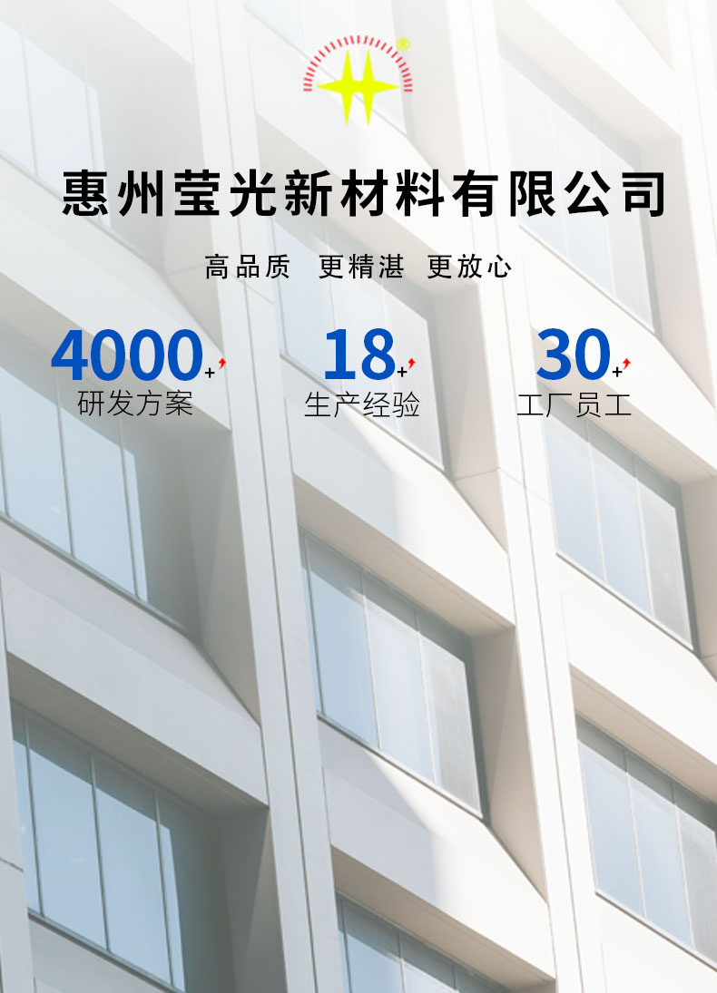 惠州莹光新材料有限公司是一家集生产研发销售为一体的企业,主营产品有夜光粉,荧光增白剂,光扩散材料,研发制造各种色母粒及塑胶配色制造色粉,原材料符合环保要求;公司在2016年已通过ISO9001:2015体系认证及 UL产品认证,注册商标;超莹光品牌,产品广泛应用于塑胶,硅胶,汽车,电子,光学板材,日用物品,油漆油墨及涂料等各个领域,公司全体注重品质,效率及细节,勇于创新!莹光公司粉体部专业代客塑胶配色并可派人至厂调色。对塑胶产品变色,黑点,分散不良,高夜光,木纹配色、大理石纹配色、流纹配色等高难度配色有较高的经验。公司自成立以来,本着珍惜每一客户,合理的价格,保证每种产品的质量,热情积极的服务态度,以保客户交期为宗旨,与客户建立了良好的关系,并得到了各方的信任。同时,技术的熟练程度得到了广大客户的好评。
