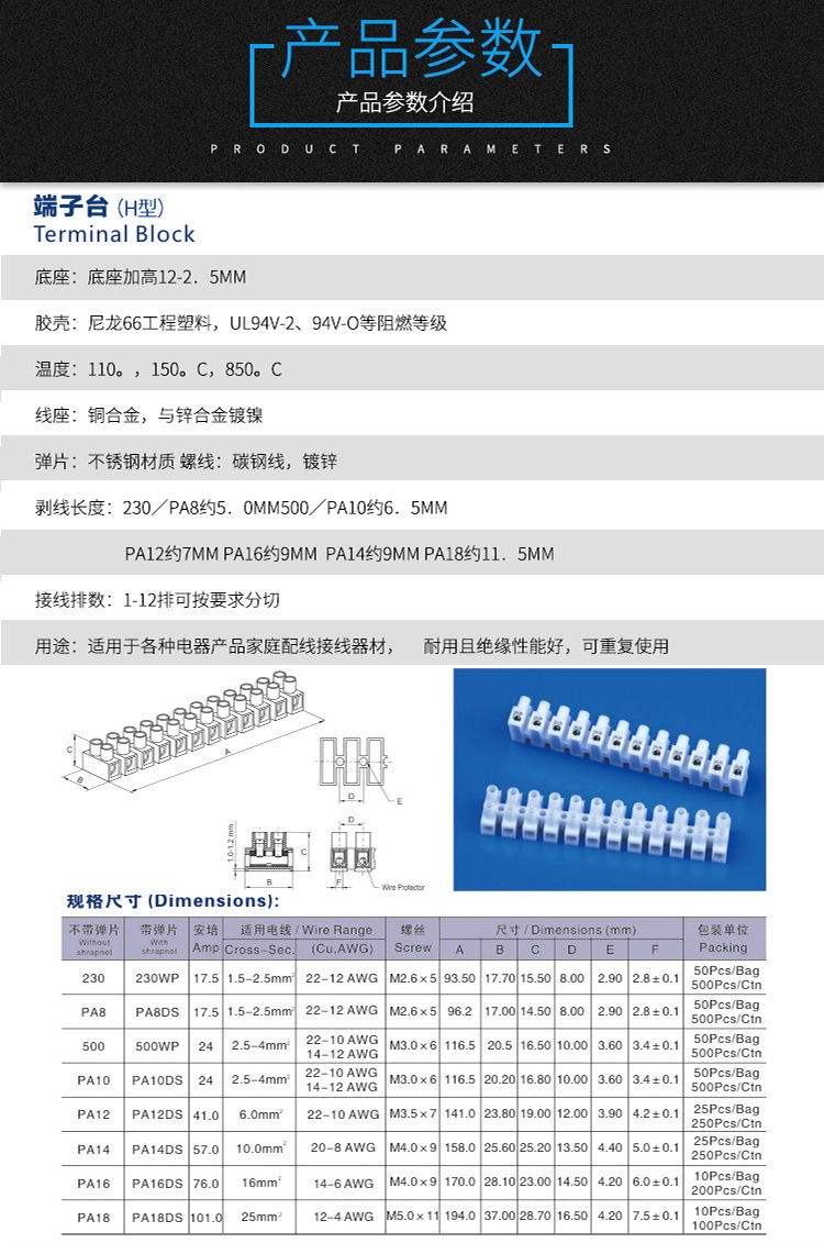 高超 尼龙平底型PA8 230-3P接线柱灯具专用端子台UL