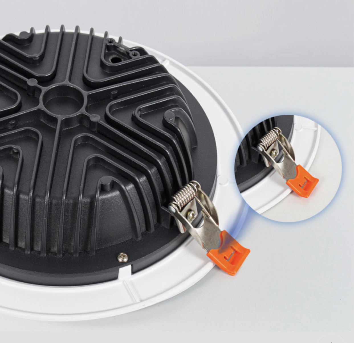 压铸铝材,鳍片散热器,采用多处散热孔的设计方案,通过空气对流散热器结构,达到散热快,性能好,使用寿命长的效果;全部采用钻孔攻牙工艺,减少装配损耗,节省大量人工;喷粉工艺雅致哑白色铝材面环,配上防眩阶梯,高透光钢化玻璃,及磨砂质地铝反光杯,使外观看起来简约又大气,优质光学结构实现产品透光率;90°大光束角设计,照明面积广,光效均匀明亮;采用高强度,加强加硬优质;弹簧,易安装,更牢固;2.5寸7W,3寸9W,4寸12W,5寸15W,6寸20W,8寸30W,多钟规格可选,应用不同场景需求。
