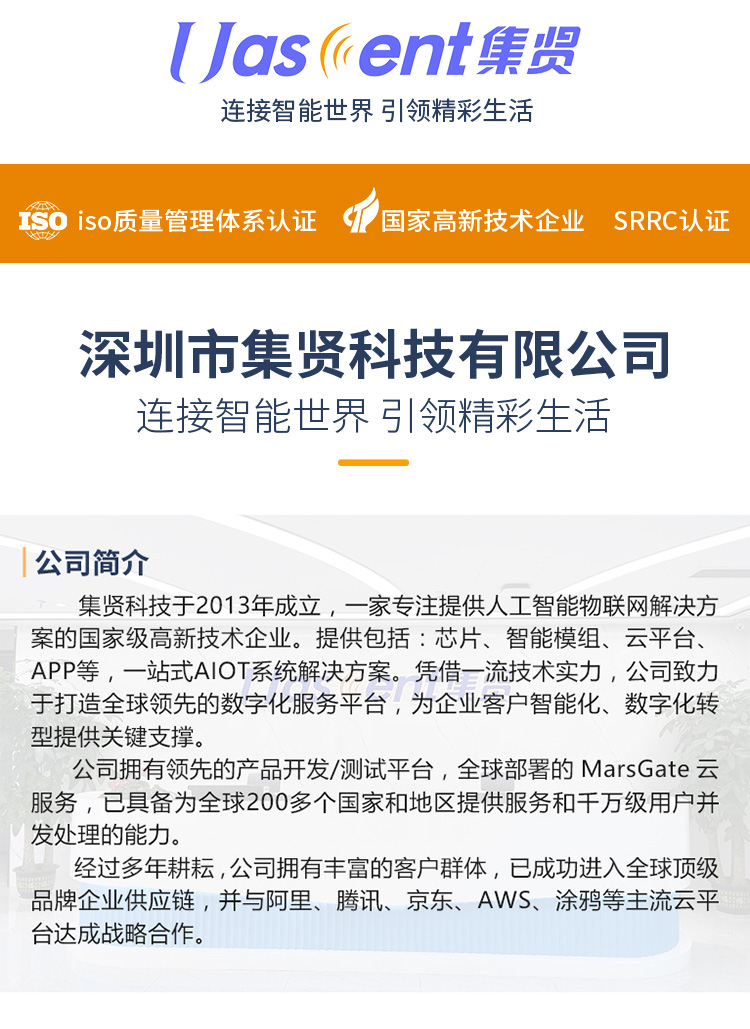 深圳市集贤科技有限公司,专注于无线通讯技术领域产品与解决方案的研发、生产、销售、运营、服务,在底层驱动、通信协议、分布式云技术、软件应用等方向具有丰富的技术经验,是可以为智能穿戴、无线通讯、无线数据交换、物联网应用(云服务+智能终端应用程序)提供全套解决方案的技术企业。合作企业——OPPO、VIVO、步步高、暴风魔镜、酷派、天猫、长虹、TCL、KONKA、创维、VIEWSONIC等。主要应用市场——智能手机、智能可穿戴设备、AR/VR、蓝牙音频、无人机、汽车电子、机器人。产品有智能飞行器、AR/VR设备控制、智能穿戴产品、智能物联网关、数据透传模块、视觉处理、人工智能、物联云平台运营等。