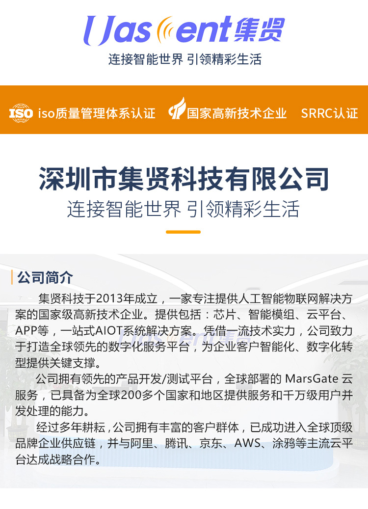 深圳市集贤科技有限公司,专注于无线通讯技术领域产品与解决方案的研发、生产、销售、运营、服务,在底层驱动、通信协议、分布式云技术、软件应用等方向具有丰富的技术经验,是可以为智能穿戴、无线通讯、无线数据交换、物联网应用(云服务+智能终端应用程序)提供全套解决方案的技术企业。合作企业——OPPO、VIVO、步步高、暴风魔镜、酷派、天猫、长虹、TCL、KONKA、创维、VIEWSONIC等。主要应用市场——智能手机、智能可穿戴设备、AR/VR、蓝牙音频、无人机、汽车电子、机器人。产品有智能飞行器、AR/VR设备控制、智能穿戴产品、智能物联网关、数据透传模块、视觉处理、人工智能、物联云平台运营等。