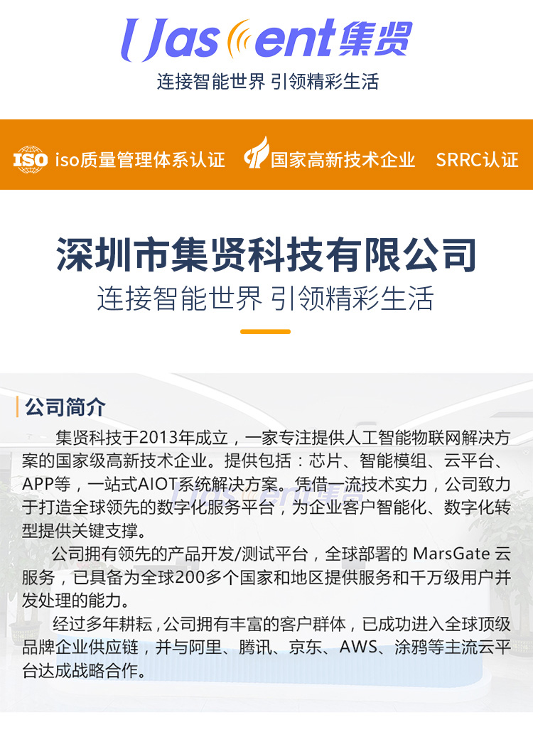 深圳市集贤科技有限公司,专注于无线通讯技术领域产品与解决方案的研发、生产、销售、运营、服务,在底层驱动、通信协议、分布式云技术、软件应用等方向具有丰富的技术经验,是可以为智能穿戴、无线通讯、无线数据交换、物联网应用(云服务+智能终端应用程序)提供全套解决方案的技术企业。合作企业——OPPO、VIVO、步步高、暴风魔镜、酷派、天猫、长虹、TCL、KONKA、创维、VIEWSONIC等。主要应用市场——智能手机、智能可穿戴设备、AR/VR、蓝牙音频、无人机、汽车电子、机器人。产品有智能飞行器、AR/VR设备控制、智能穿戴产品、智能物联网关、数据透传模块、视觉处理、人工智能、物联云平台运营等。
