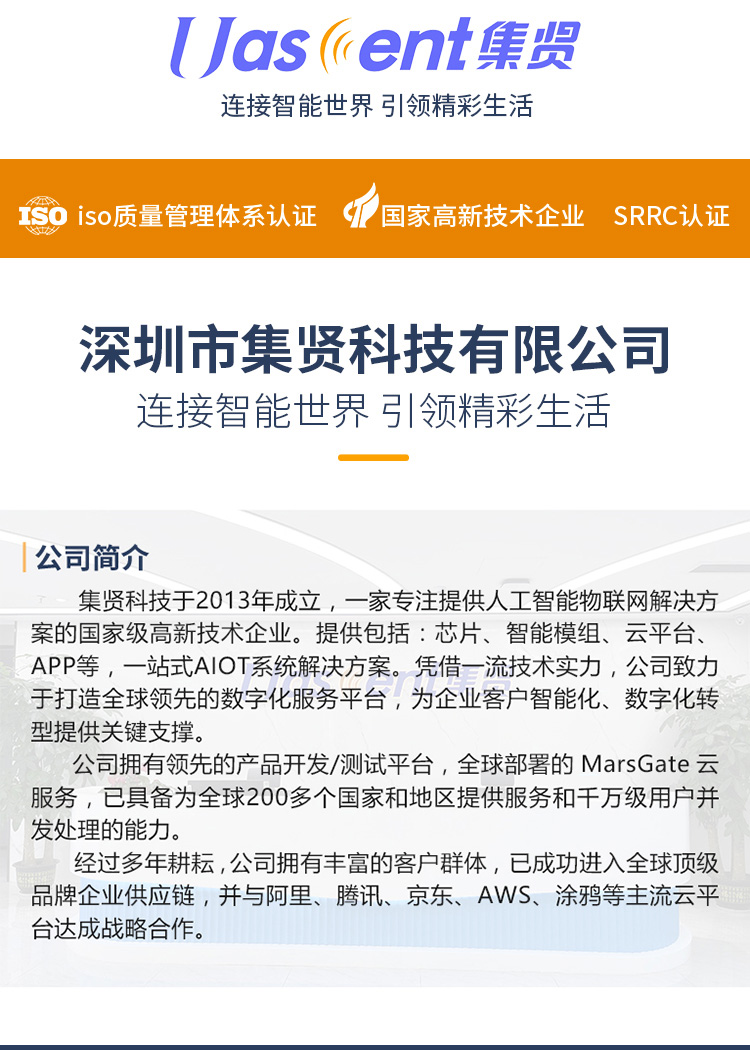 深圳市集贤科技有限公司,专注于无线通讯技术领域产品与解决方案的研发、生产、销售、运营、服务,在底层驱动、通信协议、分布式云技术、软件应用等方向具有丰富的技术经验,是可以为智能穿戴、无线通讯、无线数据交换、物联网应用(云服务+智能终端应用程序)提供全套解决方案的技术企业。合作企业——OPPO、VIVO、步步高、暴风魔镜、酷派、天猫、长虹、TCL、KONKA、创维、VIEWSONIC等。主要应用市场——智能手机、智能可穿戴设备、AR/VR、蓝牙音频、无人机、汽车电子、机器人。产品有智能飞行器、AR/VR设备控制、智能穿戴产品、智能物联网关、数据透传模块、视觉处理、人工智能、物联云平台运营等。