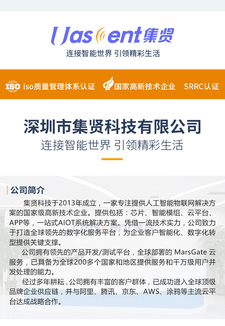 深圳市集贤科技有限公司,专注于无线通讯技术领域产品与解决方案的研发、生产、销售、运营、服务,在底层驱动、通信协议、分布式云技术、软件应用等方向具有丰富的技术经验,是可以为智能穿戴、无线通讯、无线数据交换、物联网应用(云服务+智能终端应用程序)提供全套解决方案的技术企业。合作企业——OPPO、VIVO、步步高、暴风魔镜、酷派、天猫、长虹、TCL、KONKA、创维、VIEWSONIC等。主要应用市场——智能手机、智能可穿戴设备、AR/VR、蓝牙音频、无人机、汽车电子、机器人。产品有智能飞行器、AR/VR设备控制、智能穿戴产品、智能物联网关、数据透传模块、视觉处理、人工智能、物联云平台运营等。