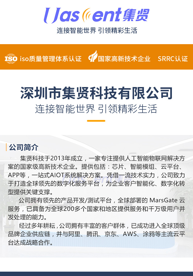深圳市集贤科技有限公司,专注于无线通讯技术领域产品与解决方案的研发、生产、销售、运营、服务,在底层驱动、通信协议、分布式云技术、软件应用等方向具有丰富的技术经验,是可以为智能穿戴、无线通讯、无线数据交换、物联网应用(云服务+智能终端应用程序)提供全套解决方案的技术企业。合作企业——OPPO、VIVO、步步高、暴风魔镜、酷派、天猫、长虹、TCL、KONKA、创维、VIEWSONIC等。主要应用市场——智能手机、智能可穿戴设备、AR/VR、蓝牙音频、无人机、汽车电子、机器人。产品有智能飞行器、AR/VR设备控制、智能穿戴产品、智能物联网关、数据透传模块、视觉处理、人工智能、物联云平台运营等。