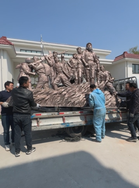采用玻璃钢材质,表面仿铜工艺处理,呈现复古金属质感,兼具铜雕的厚重感与玻璃钢的轻便耐候性。