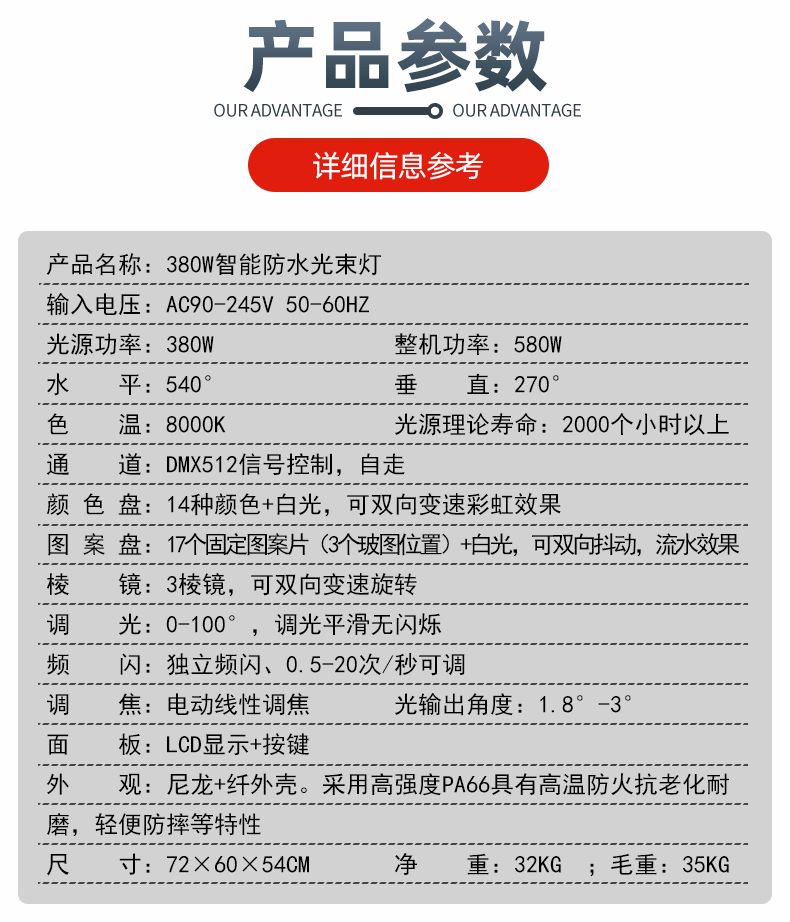 户外演出一束光探照灯380W公园灯光秀酒店楼顶使用远程防水光