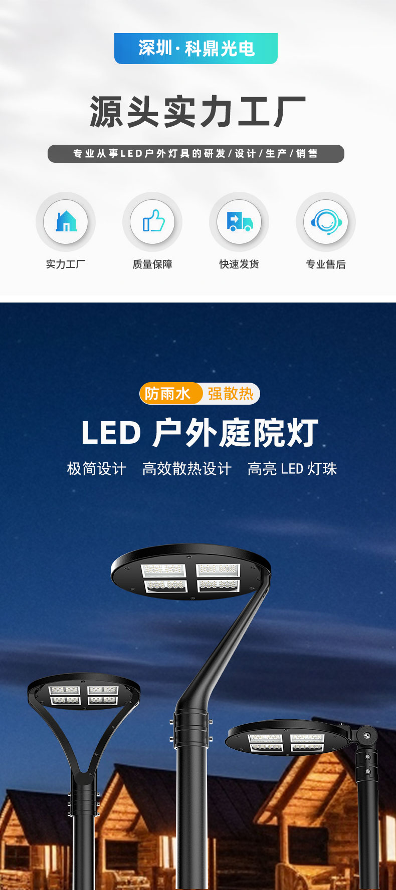 科鼎光电坐落在中国与世界重要进出口贸易基地的深圳市,公司创立于2016年,集设计、研发、生产与销售于一体,并拥有多项自主知识产权和认证,成果转化二十余项。相继获得国家高新技术企业,深圳市专精新企业等荣誉资质。公司主营产品为LED路灯、LED太阳能路灯、市电路灯、智慧路灯、LED投光灯、LED隧道灯、LED工矿灯等户外照明灯具。公司始终坚持”实施科学管理,追求卓越品质,满足客户需求”的质量方针,已通过ISO9001产品质量体系认证,有近百种的产品获得ETL、DLC、SAA、CE、RoSH、IK08/IK10等国内外相关认证。现拥有一支素质过硬、技术全面、高效、精湛的人才队伍。以“安全环保、科技创新、客户满意”为管理方针;以客为本,以质求存,以优取胜,以快为强的为经营理念。全力以赴为客户提供满意的服务,赢得了国内外客户一致肯定。