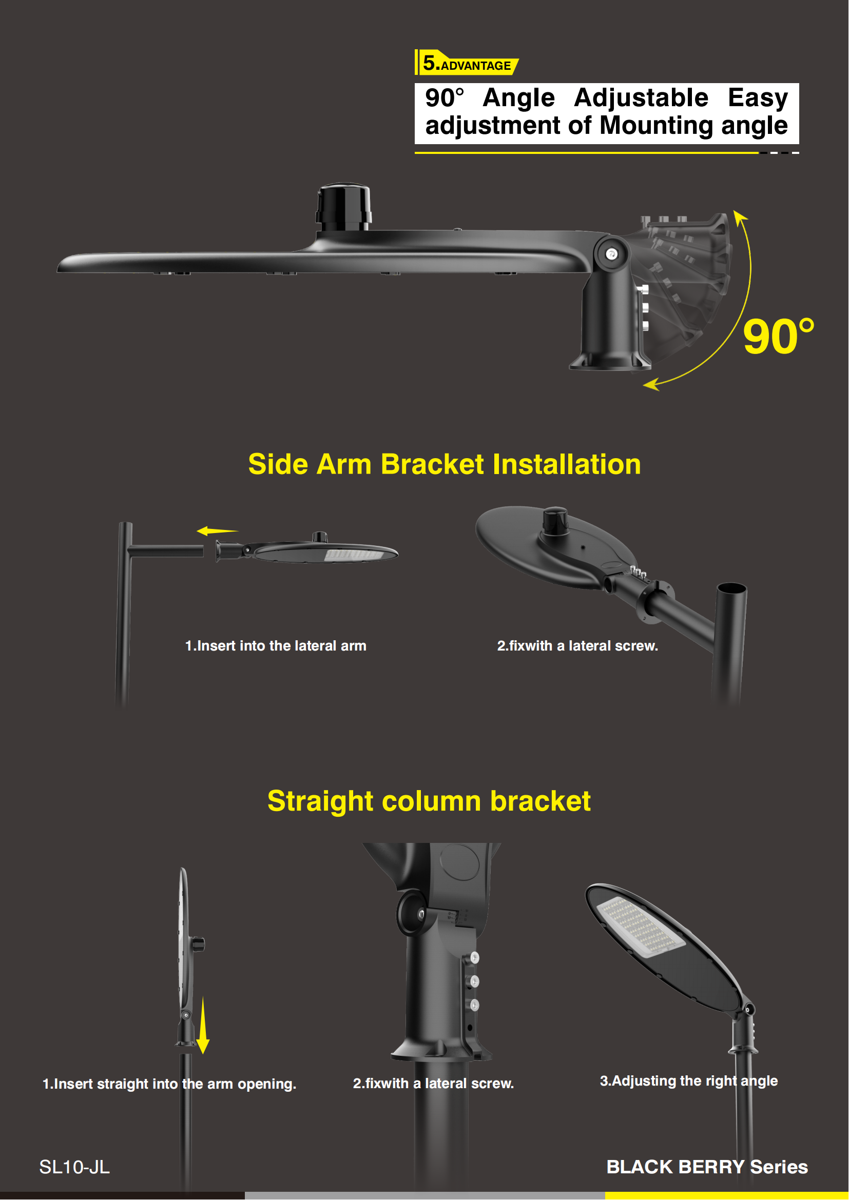 6、安装臂可180°旋转调节,可直臂安装和立杆安装。