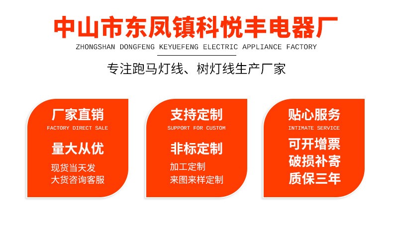 科悦丰电器厂公司成立于2003年,工厂设于广东省中山市东凤镇,主要生产户外串灯,太阳能板,露营灯串,种植补光灯,灯头,电源插头线,跑马灯,公母链接插。该公司有着经验丰富的技术人员和业务员,为客户提供综合性服务,公司以质量,服务为先,诚信共赢的经营理念,力争为客户打造高品质户外串灯产品。