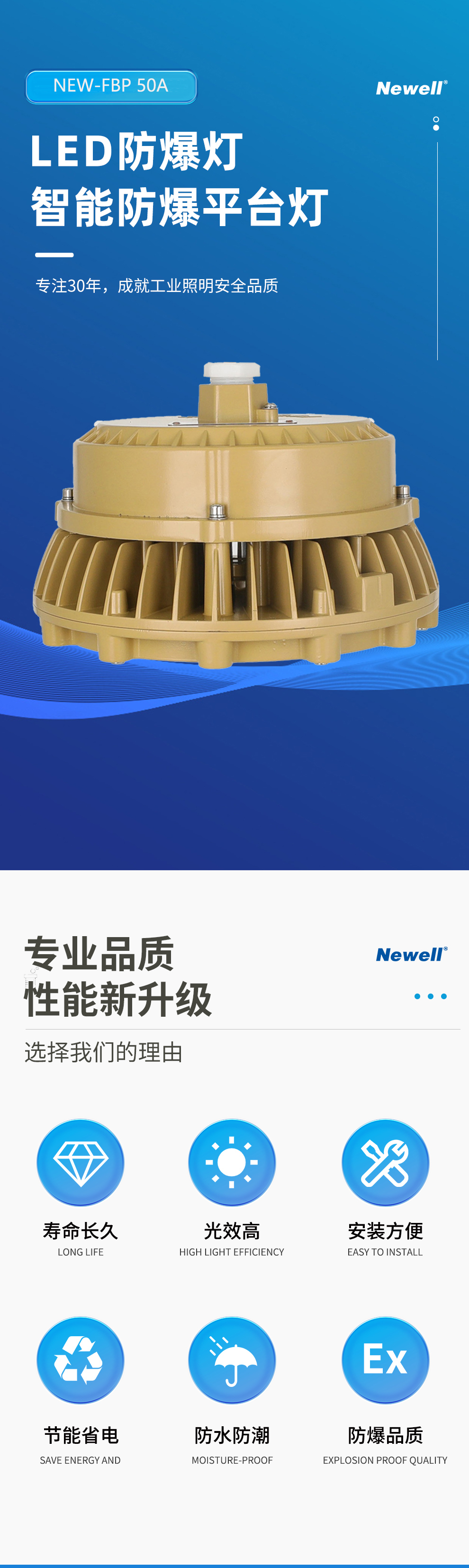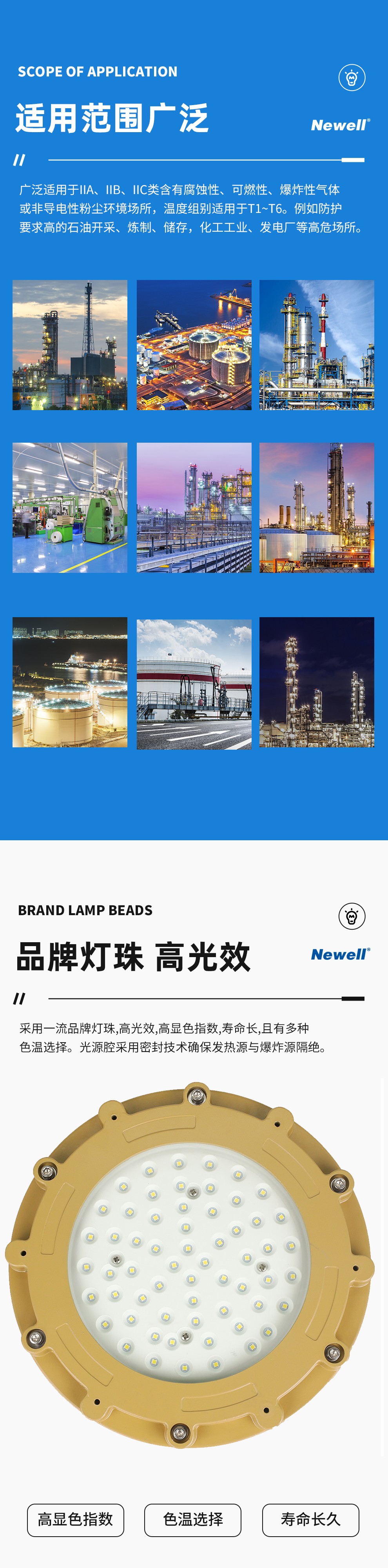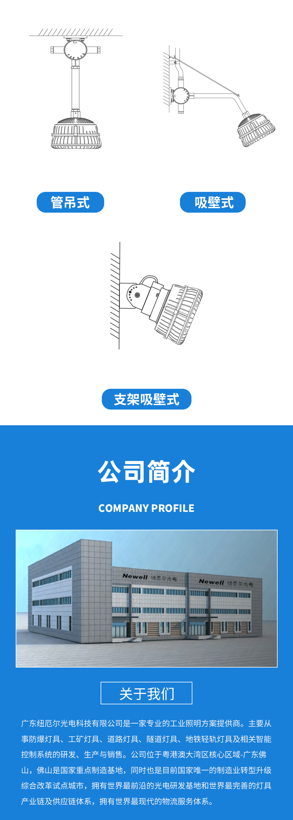 广东纽厄尔光电科技有限公司是一家专业的工业照明方案提供商。主要从事防爆灯具、工矿灯具、道路灯具、隧道灯具、地铁轻轨灯具及相关智能控制系统的研发、生产与销售。公司位于粤港澳大湾区核心区域-广东佛山,公司位于粤港澳大湾区核心区域-广东佛山,佛山是国家重点制造基地,同时也是目前国家唯一的制造业转型升级综合改革试点城市,拥有世界最前沿的光电研发基地和世界最完善的灯具产业链及供应链体系,拥有世界最现代的物流服务体系。公司通过了ISO9001质量体系认证、IS014001环境体系认证和OHSAS18001职业健康安全管理体系认证,同时获得CCC认证、节能认证以及CE、Atex、IECEX国际质量标准认证。产品广泛应用于石油、化工、冶金、电力、制造、场馆、广场、码头、道路、隧道、轨道交通等众多领域,并获得用户一致好评。同时作为国内多家知名灯具企业的OEM商,在业内享有较高声誉。公司先后荣获国家高新技术企业、广东省著名品牌、中国最具影响力灯具品牌、绿色节能环保产品、工程建设推荐产品、资信等级AAA企业、质量服务诚信AAA企业、诚信经营示范单位AAA企业、重合同守信用AAA企业等多项荣誉。公司产品遍布全国32个省、市、自治区,同时产品远销欧洲、非洲、中东、东南亚等多个国家。公司设立了华中、华北、华南、西南、海外五大运营中心,并配备优秀的运营团队,在相关的业务领域持续耕耘。同时在中国重庆、中国佛山创建了工业照明展示体验交流中心,为客户提供设计新颖、技术领先、品种齐全的工业照明产品场景展示,让客户能身临其境感受纽厄尔光电所提供的工业照明解决方案。纽厄尔光电本着“专业、专注、精益求精”的品牌精神,持续弘扬“艰苦奋斗、至诚守信、开拓创新、合作共赢”的理念,努力用光彩演绎世界。