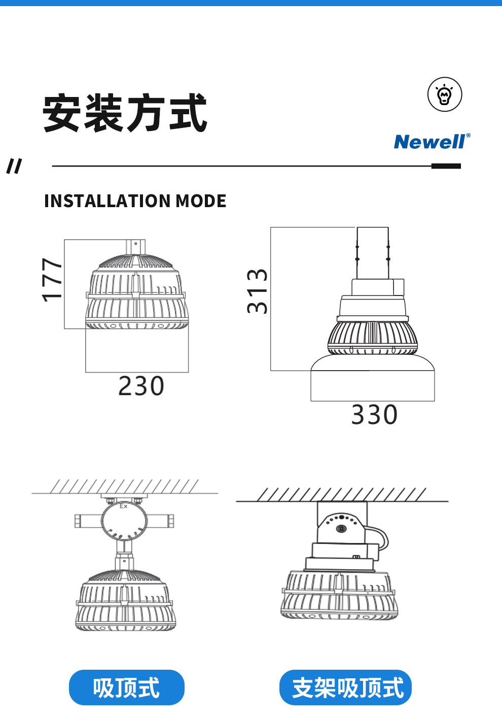 • 安装方式 吸顶式、支架式、悬吊式、壁面式、立式