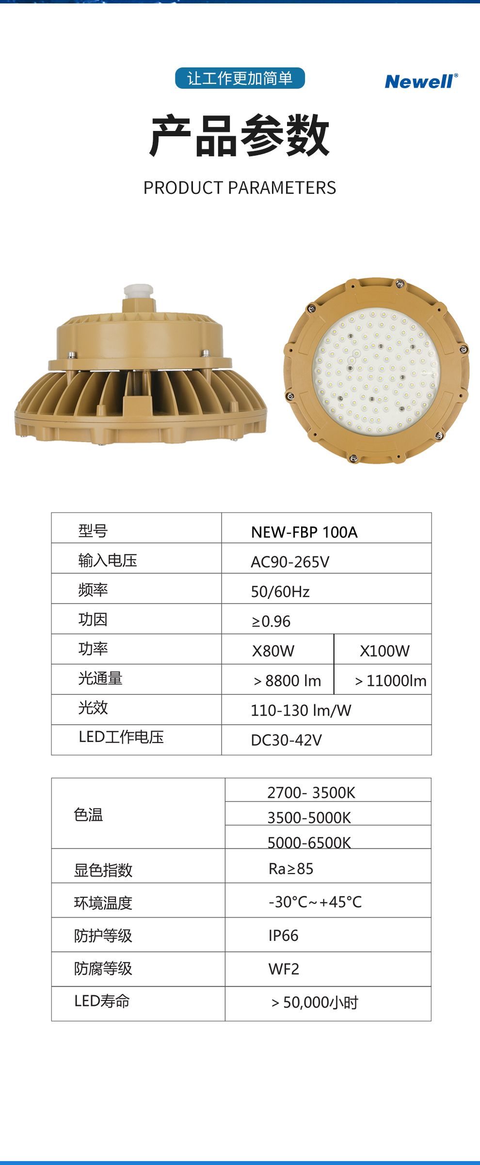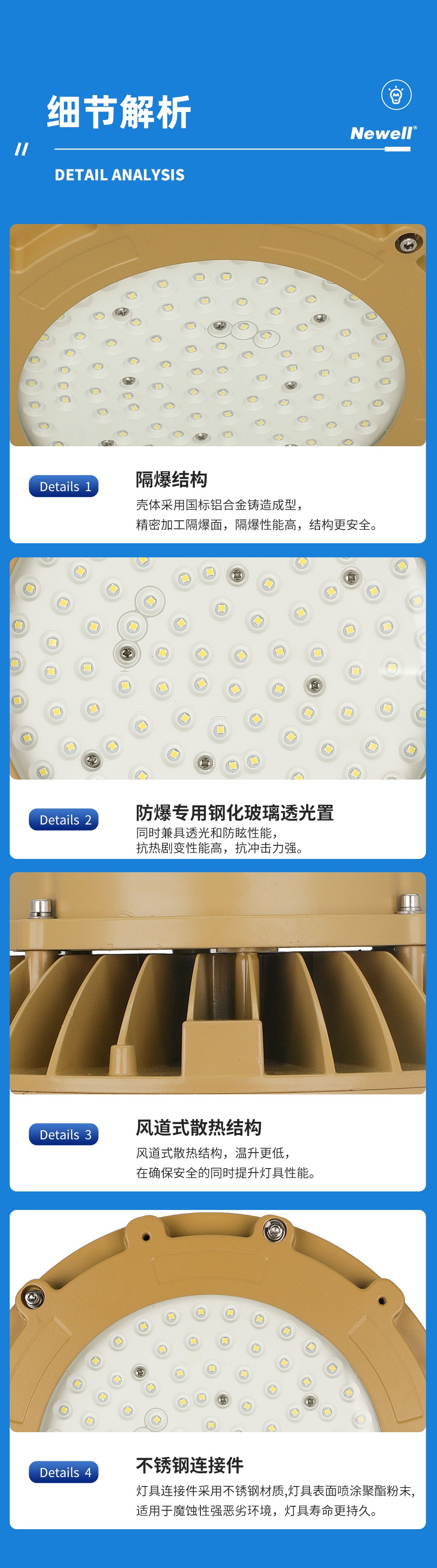 广东纽厄尔光电科技有限公司是一家专业的工业照明方案提供商。主要从事防爆灯具、工矿灯具、道路灯具、隧道灯具、地铁轻轨灯具及相关智能控制系统的研发、生产与销售。公司位于粤港澳大湾区核心区域-广东佛山,公司位于粤港澳大湾区核心区域-广东佛山,佛山是国家重点制造基地,同时也是目前国家唯一的制造业转型升级综合改革试点城市,拥有世界最前沿的光电研发基地和世界最完善的灯具产业链及供应链体系,拥有世界最现代的物流服务体系。公司通过了ISO9001质量体系认证、IS014001环境体系认证和OHSAS18001职业健康安全管理体系认证,同时获得CCC认证、节能认证以及CE、Atex、IECEX国际质量标准认证。产品广泛应用于石油、化工、冶金、电力、制造、场馆、广场、码头、道路、隧道、轨道交通等众多领域,并获得用户一致好评。同时作为国内多家知名灯具企业的OEM商,在业内享有较高声誉。公司先后荣获国家高新技术企业、广东省著名品牌、中国最具影响力灯具品牌、绿色节能环保产品、工程建设推荐产品、资信等级AAA企业、质量服务诚信AAA企业、诚信经营示范单位AAA企业、重合同守信用AAA企业等多项荣誉。公司产品遍布全国32个省、市、自治区,同时产品远销欧洲、非洲、中东、东南亚等多个国家。公司设立了华中、华北、华南、西南、海外五大运营中心,并配备优秀的运营团队,在相关的业务领域持续耕耘。同时在中国重庆、中国佛山创建了工业照明展示体验交流中心,为客户提供设计新颖、技术领先、品种齐全的工业照明产品场景展示,让客户能身临其境感受纽厄尔光电所提供的工业照明解决方案。纽厄尔光电本着“专业、专注、精益求精”的品牌精神,持续弘扬“艰苦奋斗、至诚守信、开拓创新、合作共赢”的理念,努力用光彩演绎世界。