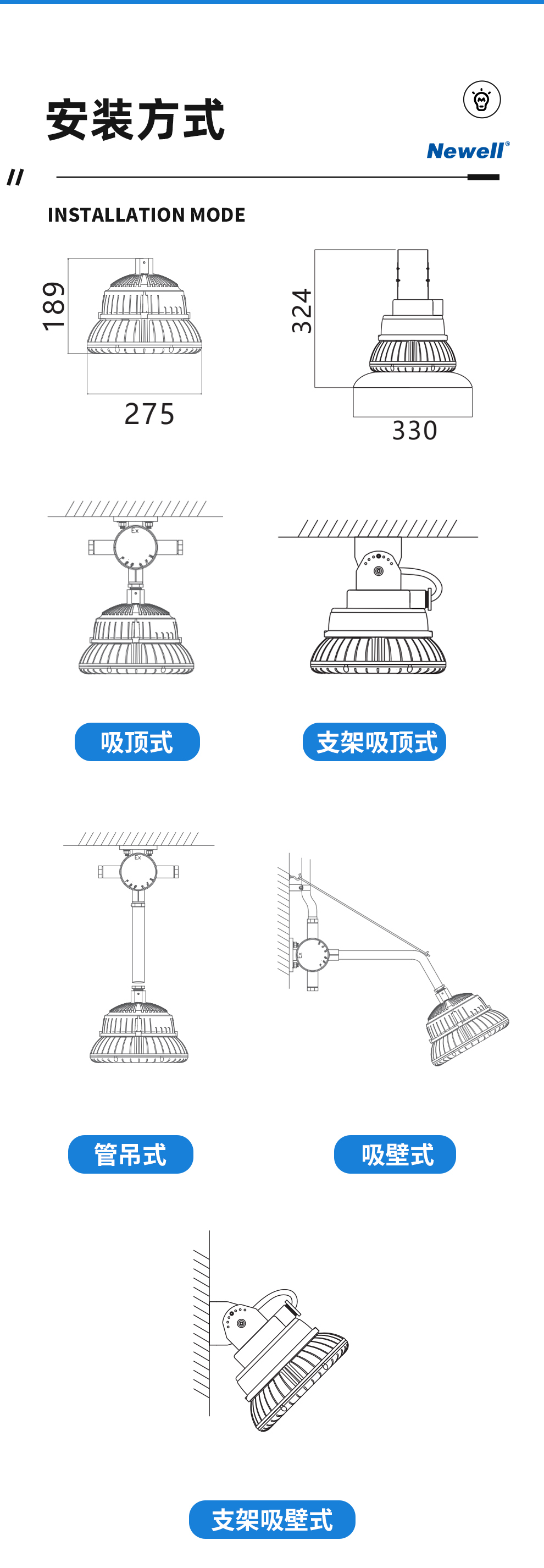 • 安装方式 吸顶式、支架式、悬吊式、壁面式、立式
