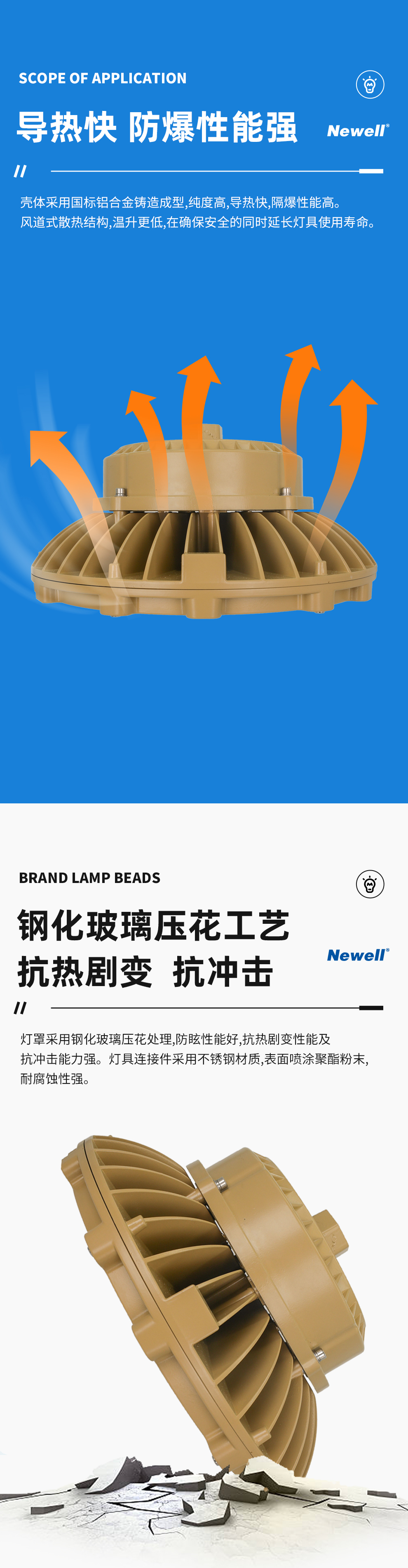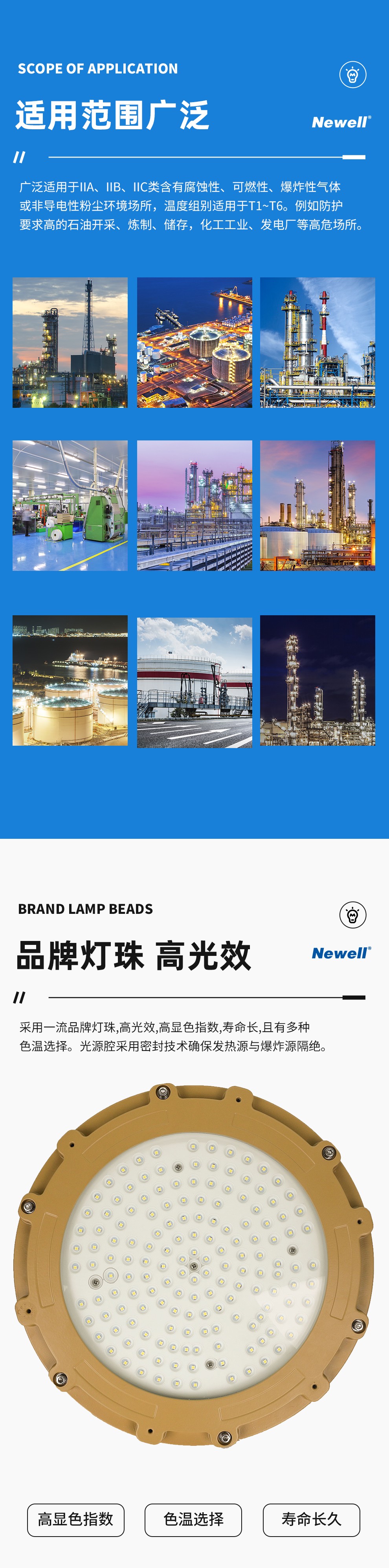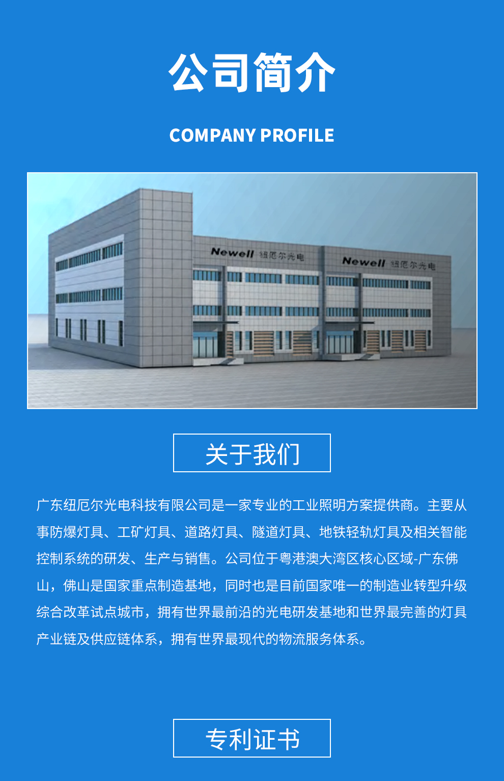广东纽厄尔光电科技有限公司是一家专业的工业照明方案提供商。主要从事防爆灯具、工矿灯具、道路灯具、隧道灯具、地铁轻轨灯具及相关智能控制系统的研发、生产与销售。公司位于粤港澳大湾区核心区域-广东佛山,公司位于粤港澳大湾区核心区域-广东佛山,佛山是国家重点制造基地,同时也是目前国家唯一的制造业转型升级综合改革试点城市,拥有世界最前沿的光电研发基地和世界最完善的灯具产业链及供应链体系,拥有世界最现代的物流服务体系。公司通过了ISO9001质量体系认证、IS014001环境体系认证和OHSAS18001职业健康安全管理体系认证,同时获得CCC认证、节能认证以及CE、Atex、IECEX国际质量标准认证。产品广泛应用于石油、化工、冶金、电力、制造、场馆、广场、码头、道路、隧道、轨道交通等众多领域,并获得用户一致好评。同时作为国内多家知名灯具企业的OEM商,在业内享有较高声誉。公司先后荣获国家高新技术企业、广东省著名品牌、中国最具影响力灯具品牌、绿色节能环保产品、工程建设推荐产品、资信等级AAA企业、质量服务诚信AAA企业、诚信经营示范单位AAA企业、重合同守信用AAA企业等多项荣誉。公司产品遍布全国32个省、市、自治区,同时产品远销欧洲、非洲、中东、东南亚等多个国家。公司设立了华中、华北、华南、西南、海外五大运营中心,并配备优秀的运营团队,在相关的业务领域持续耕耘。同时在中国重庆、中国佛山创建了工业照明展示体验交流中心,为客户提供设计新颖、技术领先、品种齐全的工业照明产品场景展示,让客户能身临其境感受纽厄尔光电所提供的工业照明解决方案。纽厄尔光电本着“专业、专注、精益求精”的品牌精神,持续弘扬“艰苦奋斗、至诚守信、开拓创新、合作共赢”的理念,努力用光彩演绎世界。