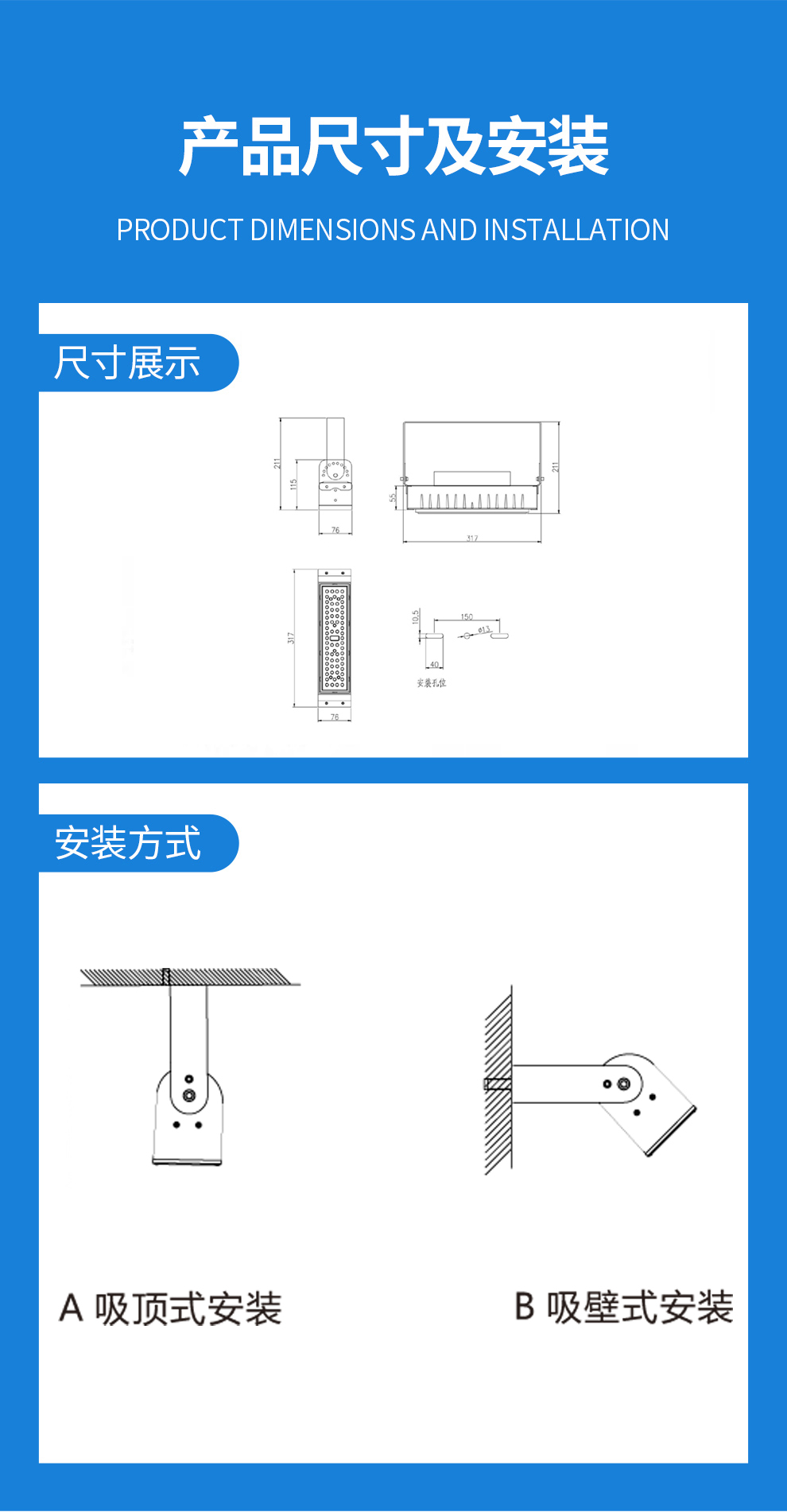 • 安装方式 吸顶式、支架式、悬吊式、可拼接式、壁面式、立式