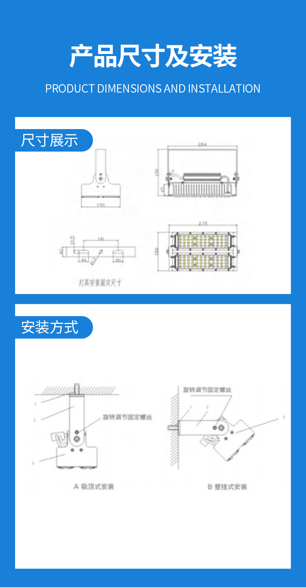 • 安装方式 吸顶式、支架式、悬吊式、可拼接式、壁面式、立式