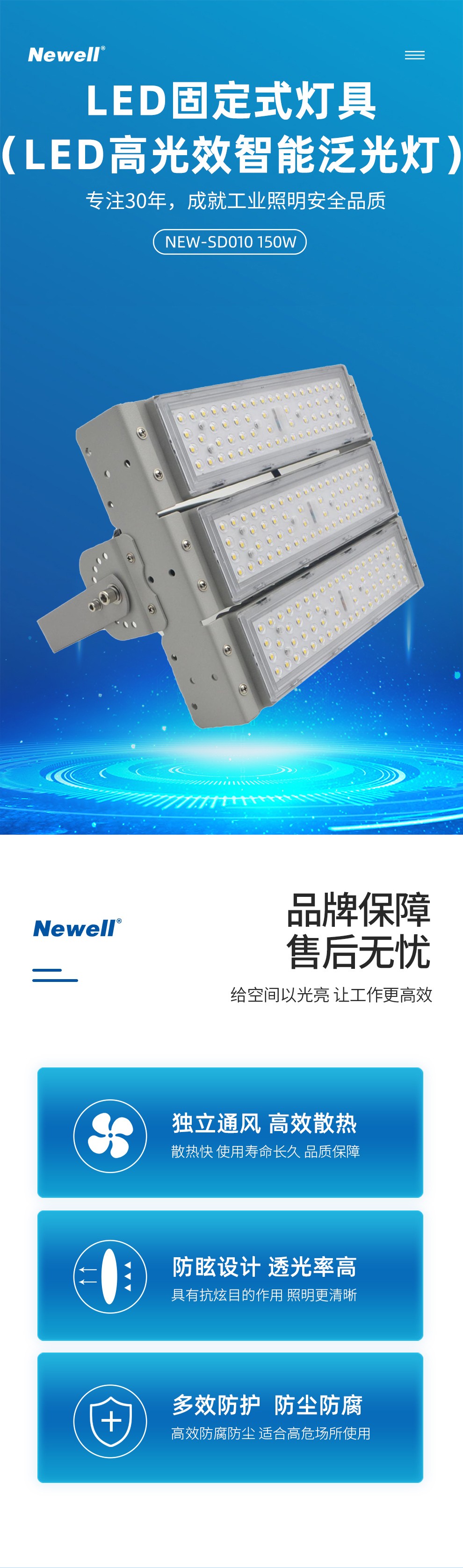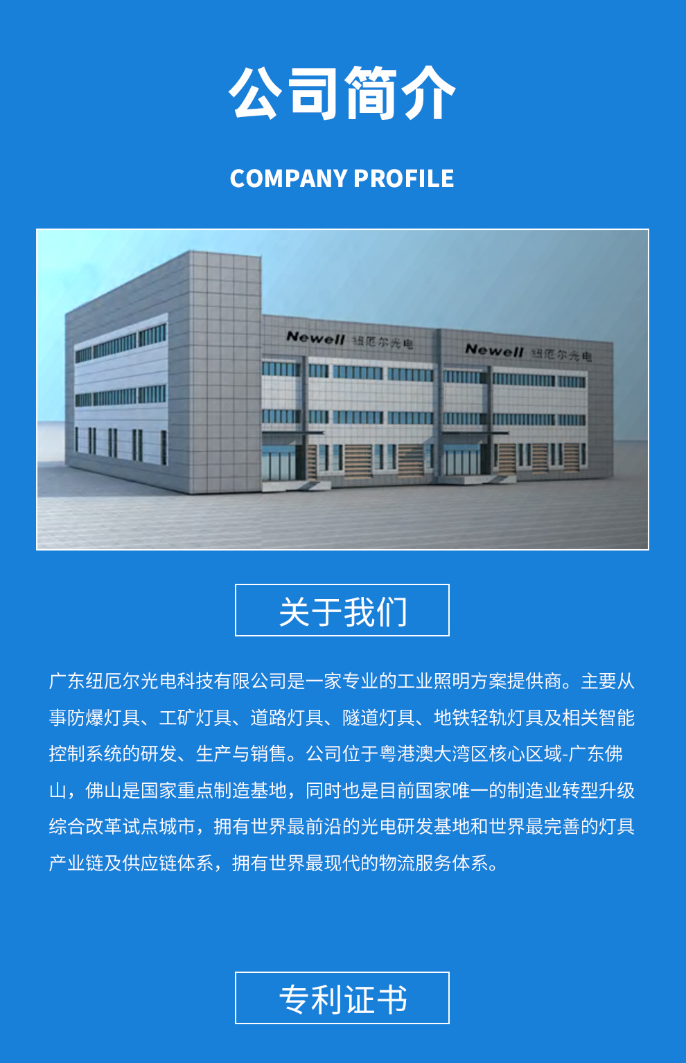 广东纽厄尔光电科技有限公司是一家专业的工业照明方案提供商。主要从事防爆灯具、工矿灯具、道路灯具、隧道灯具、地铁轻轨灯具及相关智能控制系统的研发、生产与销售。公司位于粤港澳大湾区核心区域-广东佛山,公司位于粤港澳大湾区核心区域-广东佛山,佛山是国家重点制造基地,同时也是目前国家唯一的制造业转型升级综合改革试点城市,拥有世界最前沿的光电研发基地和世界最完善的灯具产业链及供应链体系,拥有世界最现代的物流服务体系。公司通过了ISO9001质量体系认证、IS014001环境体系认证和OHSAS18001职业健康安全管理体系认证,同时获得CCC认证、节能认证以及CE、Atex、IECEX国际质量标准认证。产品广泛应用于石油、化工、冶金、电力、制造、场馆、广场、码头、道路、隧道、轨道交通等众多领域,并获得用户一致好评。同时作为国内多家知名灯具企业的OEM商,在业内享有较高声誉。公司先后荣获国家高新技术企业、广东省著名品牌、中国最具影响力灯具品牌、绿色节能环保产品、工程建设推荐产品、资信等级AAA企业、质量服务诚信AAA企业、诚信经营示范单位AAA企业、重合同守信用AAA企业等多项荣誉。公司产品遍布全国32个省、市、自治区,同时产品远销欧洲、非洲、中东、东南亚等多个国家。公司设立了华中、华北、华南、西南、海外五大运营中心,并配备优秀的运营团队,在相关的业务领域持续耕耘。同时在中国重庆、中国佛山创建了工业照明展示体验交流中心,为客户提供设计新颖、技术领先、品种齐全的工业照明产品场景展示,让客户能身临其境感受纽厄尔光电所提供的工业照明解决方案。纽厄尔光电本着“专业、专注、精益求精”的品牌精神,持续弘扬“艰苦奋斗、至诚守信、开拓创新、合作共赢”的理念,努力用光彩演绎世界。