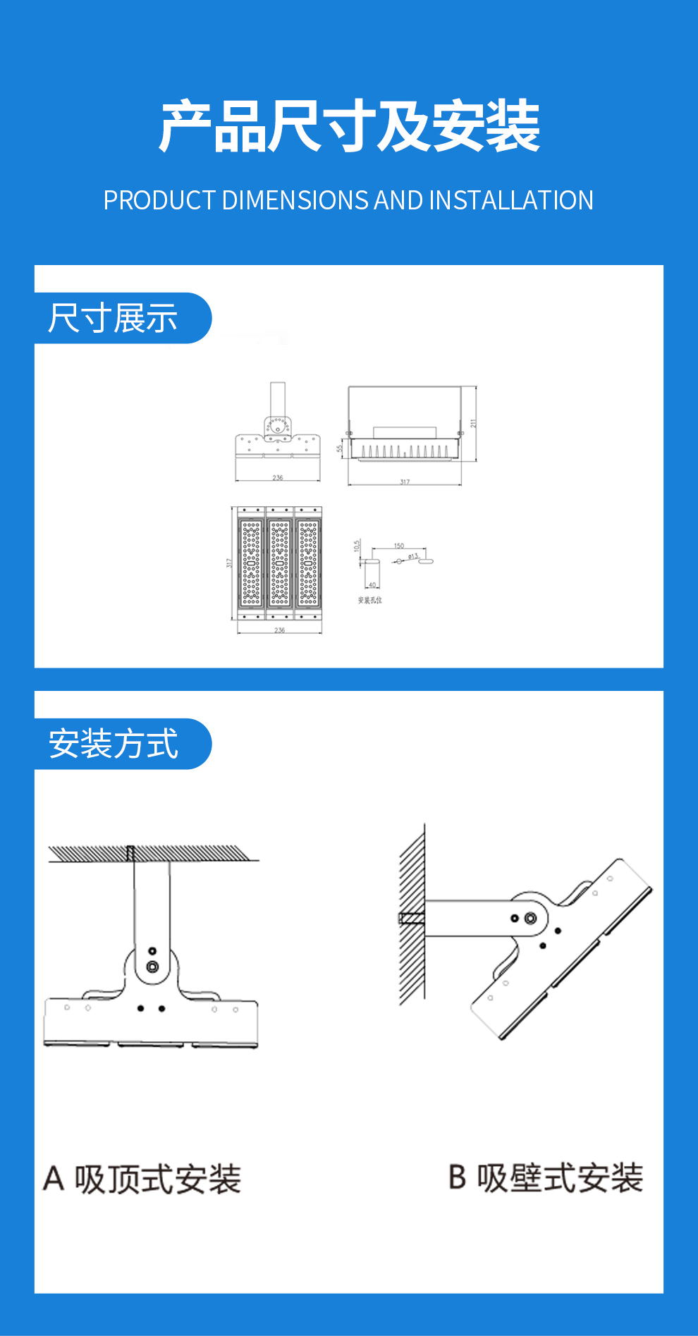 • 安装方式 吸顶式、支架式、悬吊式、可拼接式、壁面式、立式