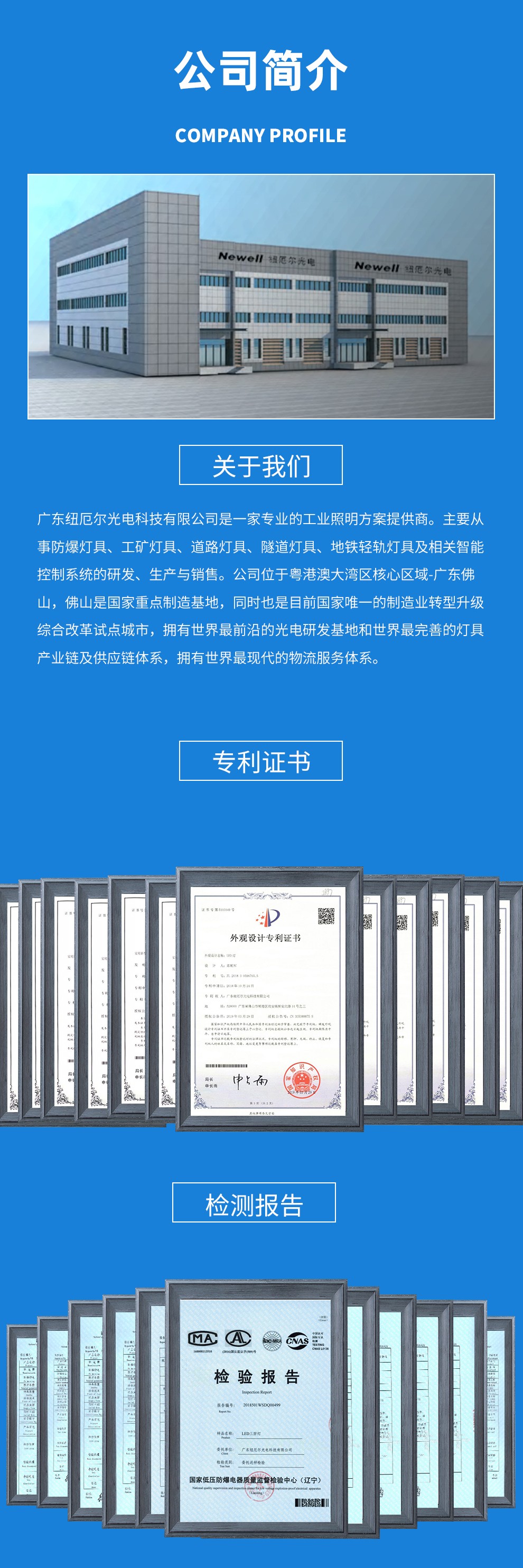 广东纽厄尔光电科技有限公司是一家专业的工业照明方案提供商。主要从事防爆灯具、工矿灯具、道路灯具、隧道灯具、地铁轻轨灯具及相关智能控制系统的研发、生产与销售。公司位于粤港澳大湾区核心区域-广东佛山,公司位于粤港澳大湾区核心区域-广东佛山,佛山是国家重点制造基地,同时也是目前国家唯一的制造业转型升级综合改革试点城市,拥有世界最前沿的光电研发基地和世界最完善的灯具产业链及供应链体系,拥有世界最现代的物流服务体系。公司通过了ISO9001质量体系认证、IS014001环境体系认证和OHSAS18001职业健康安全管理体系认证,同时获得CCC认证、节能认证以及CE、Atex、IECEX国际质量标准认证。产品广泛应用于石油、化工、冶金、电力、制造、场馆、广场、码头、道路、隧道、轨道交通等众多领域,并获得用户一致好评。同时作为国内多家知名灯具企业的OEM商,在业内享有较高声誉。公司先后荣获国家高新技术企业、广东省著名品牌、中国最具影响力灯具品牌、绿色节能环保产品、工程建设推荐产品、资信等级AAA企业、质量服务诚信AAA企业、诚信经营示范单位AAA企业、重合同守信用AAA企业等多项荣誉。公司产品遍布全国32个省、市、自治区,同时产品远销欧洲、非洲、中东、东南亚等多个国家。公司设立了华中、华北、华南、西南、海外五大运营中心,并配备优秀的运营团队,在相关的业务领域持续耕耘。同时在中国重庆、中国佛山创建了工业照明展示体验交流中心,为客户提供设计新颖、技术领先、品种齐全的工业照明产品场景展示,让客户能身临其境感受纽厄尔光电所提供的工业照明解决方案。纽厄尔光电本着“专业、专注、精益求精”的品牌精神,持续弘扬“艰苦奋斗、至诚守信、开拓创新、合作共赢”的理念,努力用光彩演绎世界。