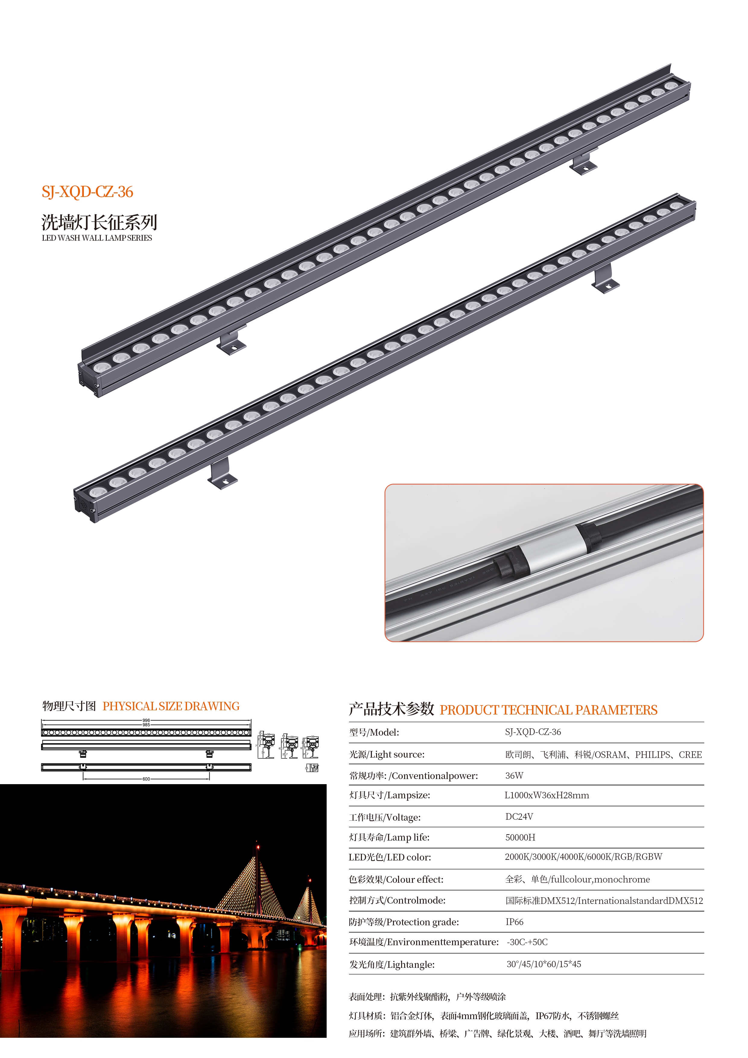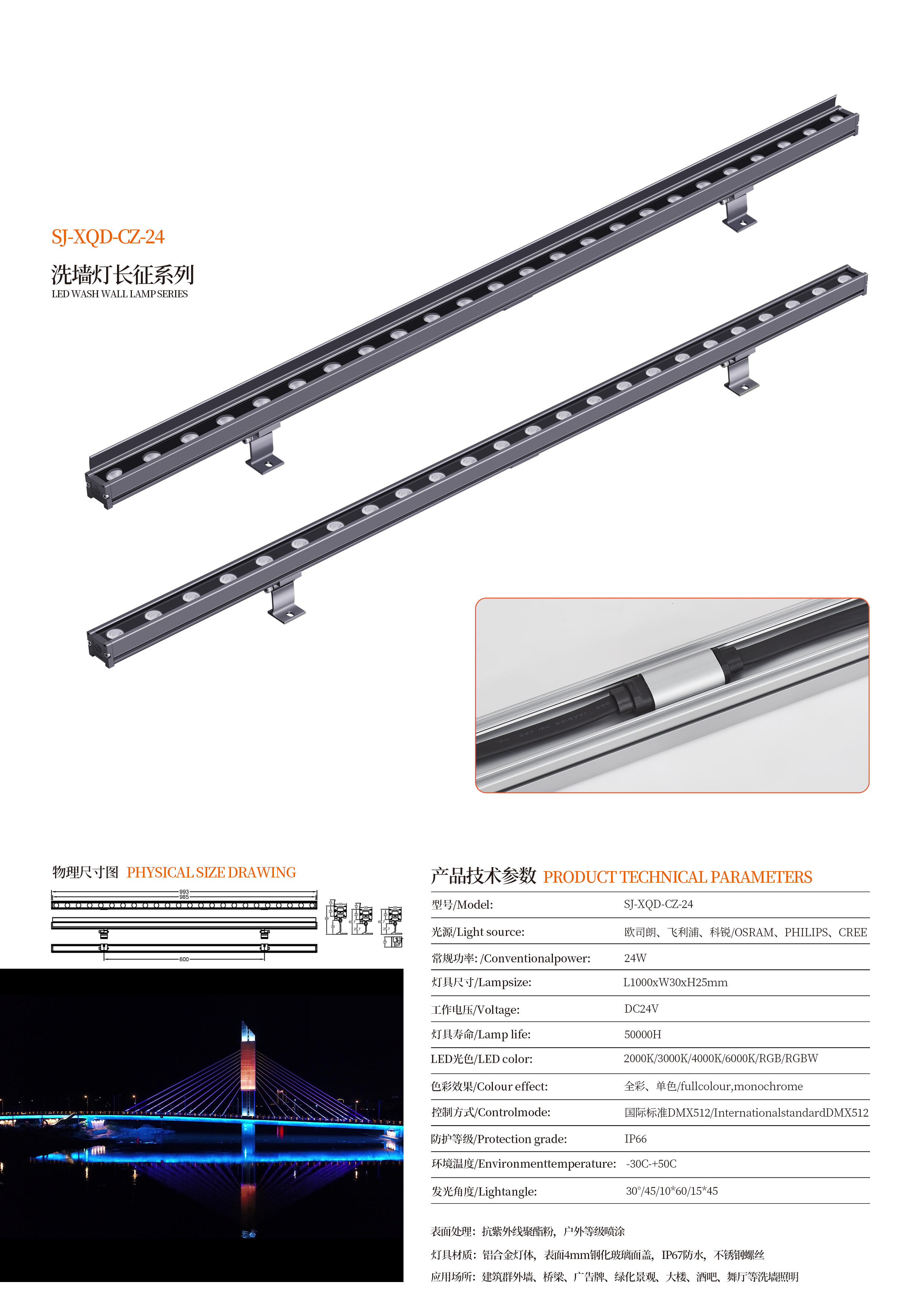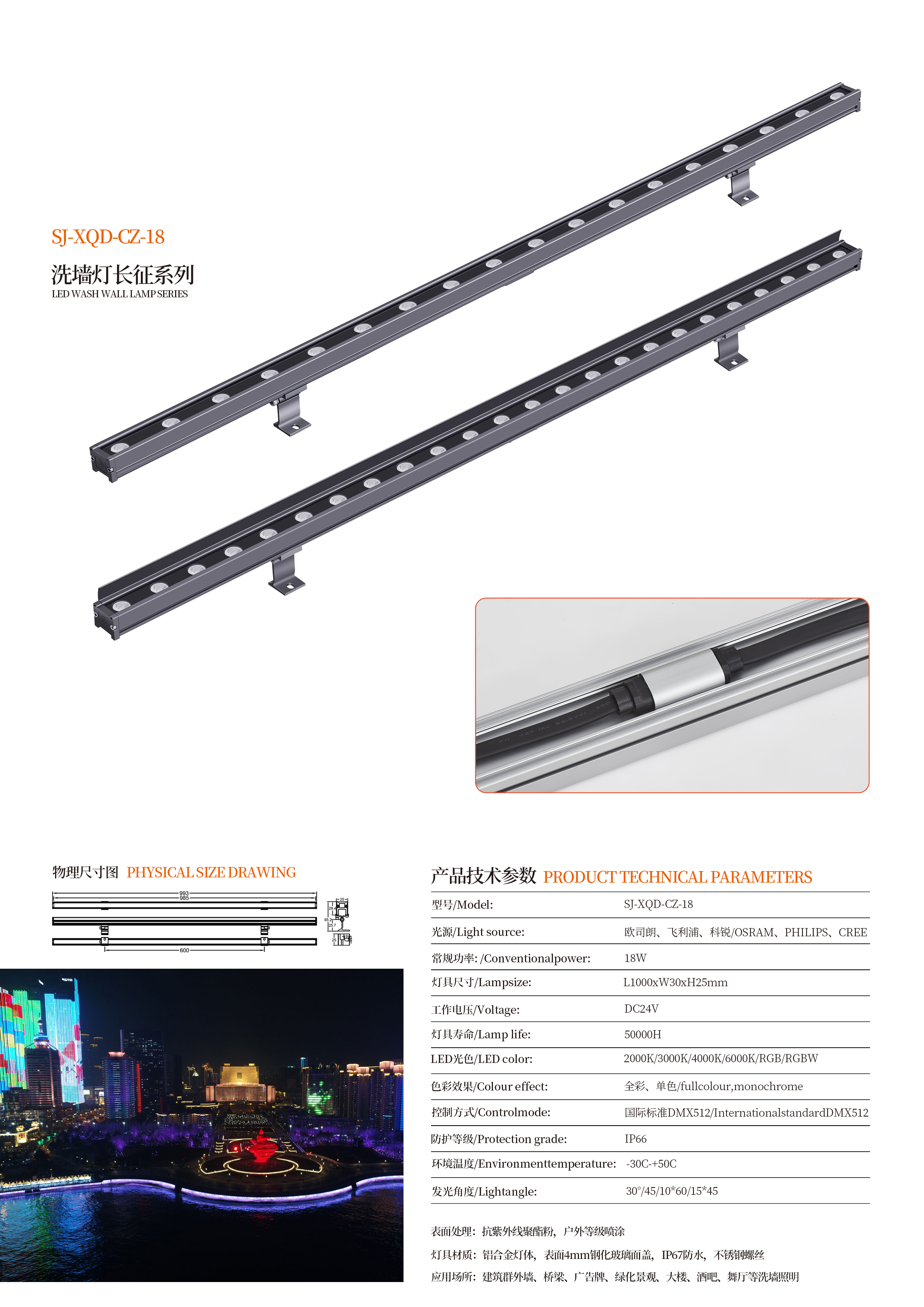 广东三建照明实业有限公司成立于2013年,是一家专注于户外亮化照明产品研发、生产的高新技术企业。秉承着“以质量求生存 以创新求发展”的理念,近年来公司持续加大研发投入,在材料、结构、生产工艺等方面不断探索创新,多款产品具有行业领先技术优势,获得市场高度认可。 (新型)洗墙灯、线条灯具有独特的防水结构(无胶工艺),安装快捷、发光效率高、色温稳定、产品寿命长且极具性价比,是建筑群楼、高架桥梁、园林景观、户外广告牌、商业门头等亮化工程的首选。支持定制、OEM/ODM。