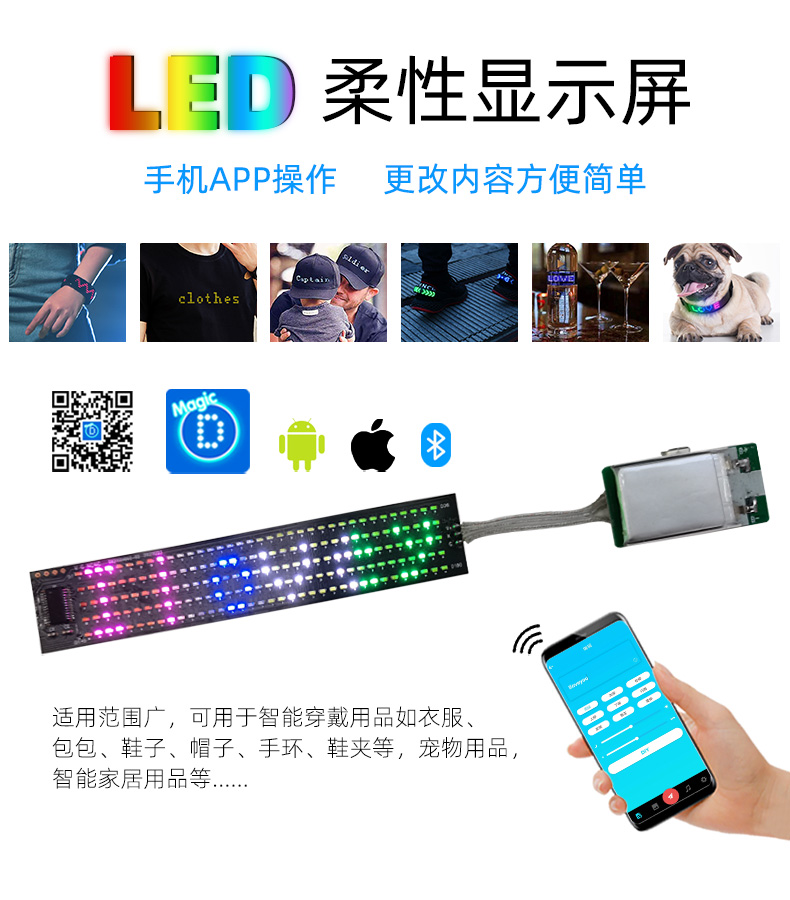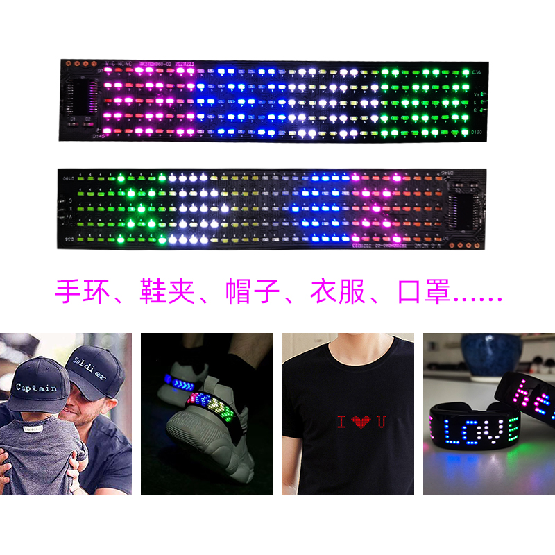 LED柔性显示屏,应用场景广泛,可以用于帽子、衣服、包包等,彰显个性。分辨率有5*36、12*48、16*64三个规格。