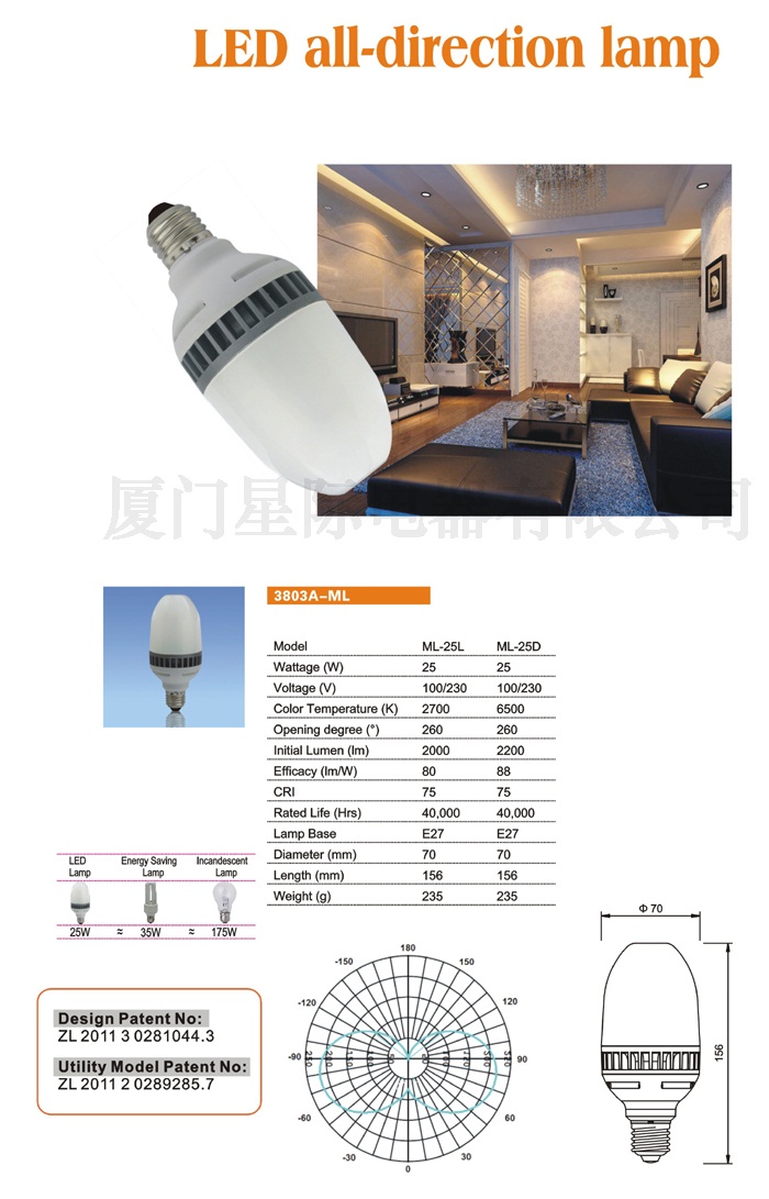 厦门星际电器有限公司于2001年5月24日注册设立,现资本总额1.99亿(人民币),系专业开发和生产紧凑型荧光灯(CFL/节能灯)、LED灯和光源驱动等产品厂家,是中国电光源制造行业百强企业,年产品销售额5.25亿元。 公司地址:厦门市湖里区禾山路1619号 公司厂房总面积21500m2,员工总人数1600人。 公司拥有从设计、试制、制造、检测的技术团队及生产、供应链。能实现快速研发、快速生产、快速交货、快速回应的客户服务机制,是国内外等知名电光源品牌的ODM(参与产品的设计及制造)指定合作供应商。 企业的发展战略是:做一家纯粹的技术应用型公司,以设计为核心,掌握工程、创新、技术,发现、分享一些东西,使商业价值需要和用户价值保持一致。 公司已获得ISO9001:2008(设计与生产制造)质量体系认证和UL/CUL、Energy Star(美国能源之星)、CE等国际产品认证。 挑战将推动和实现产品、流程、经营和业务模式的创新,企业要实现增长,客户的价值主张、环境保护(环保考虑、“绿色”供应链、替代能源)、知识产权的保护与创新、企业的社会责任,有明确的目标和方向。 企业精神:劳作、创造、超越。 质量方针:细化管理、落实到人、持续改进 产品理念:实用、品位、价廉 公司愿景:在未来的发展中,企业不应光顾自己赚钱,还要使整个社会的价值能得到更好的体现,把社会的获利当作公司的武器,使企业和社会都更加美好
