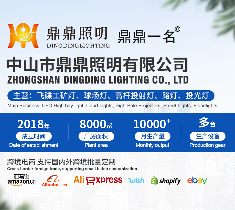 中山市鼎鼎照明有限公司2018年成立于享有“中国灯饰之都”美誉的中山市古镇镇。公司拥有8000平方五金车间,是一家集研发、生产、销售、服务于一体的专业LED照明企业。主要生产UFO飞碟工矿灯、高杆投射灯、路灯、投光灯等工业工程照明灯具。公司严格按照ISO9001和CCC质量体系标准进行质量管理。产品取得了CCC、CE、ROHS、FCC等认证和外观专利,并远销欧、美、中东、东南亚等多个国家和地区。鼎鼎照明热忱欢迎广大客户光临指导、洽谈业务,与您建立持久互利的合作关系。欢迎前来参观咨询! 地址:广东省中山市古镇镇东岸北路460号C栋