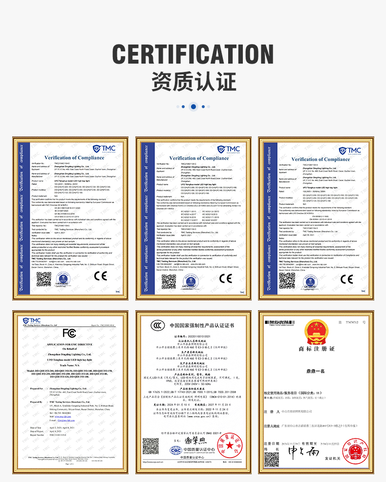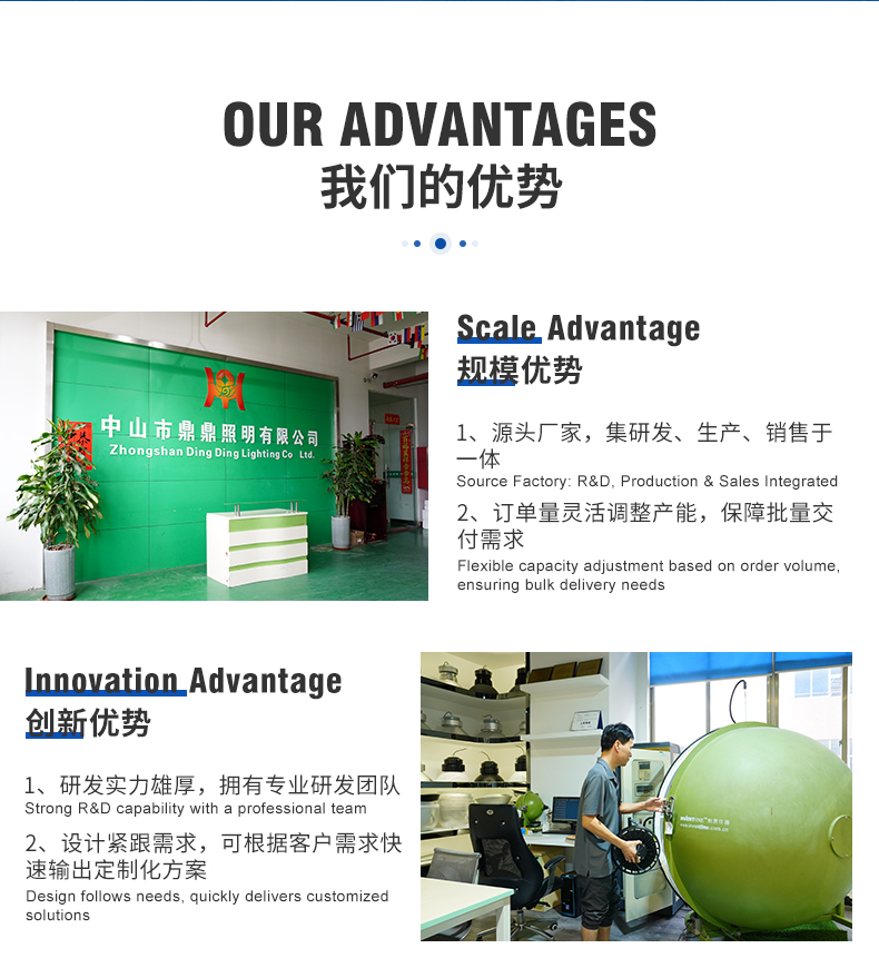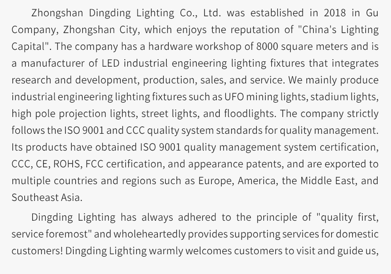 中山市鼎鼎照明有限公司2018年成立于享有“中国灯饰之都”美誉的中山市古镇镇。公司拥有8000平方五金车间,是一家集研发、生产、销售、服务于一体的专业LED照明企业。主要生产UFO飞碟工矿灯、高杆投射灯、路灯、投光灯等工业工程照明灯具。公司严格按照ISO9001和CCC质量体系标准进行质量管理。产品取得了CCC、CE、ROHS、FCC等认证和外观专利,并远销欧、美、中东、东南亚等多个国家和地区。鼎鼎照明热忱欢迎广大客户光临指导、洽谈业务,与您建立持久互利的合作关系。欢迎前来参观咨询! 地址:广东省中山市古镇镇东岸北路460号C栋