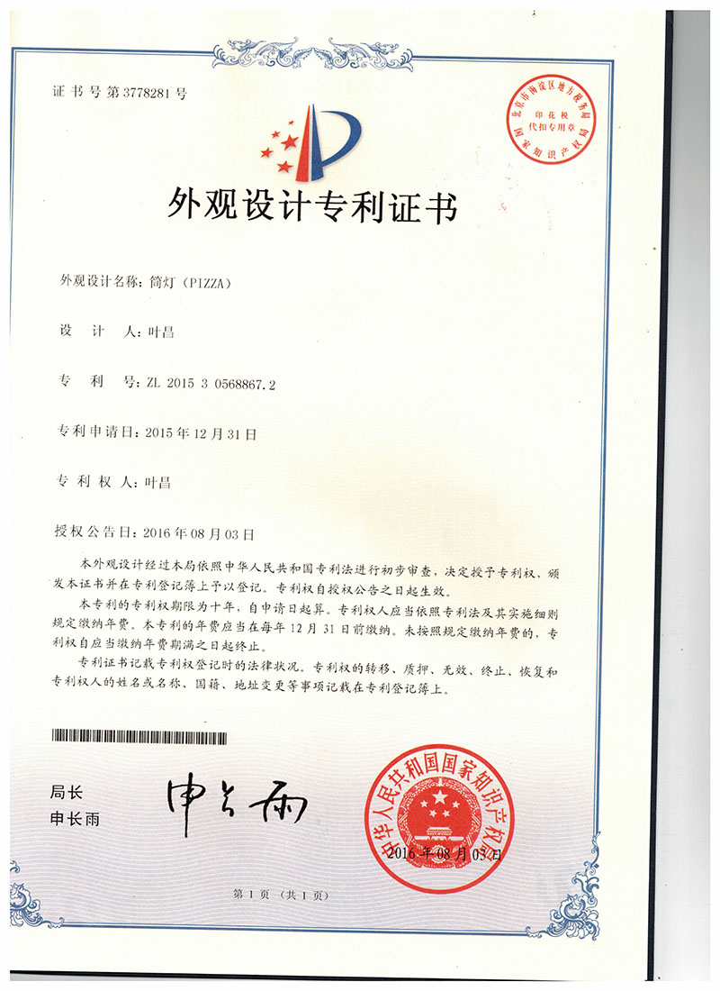 PIZZA系列筒灯的外观设计荣获国家专利。专利号ZL201530568867.2