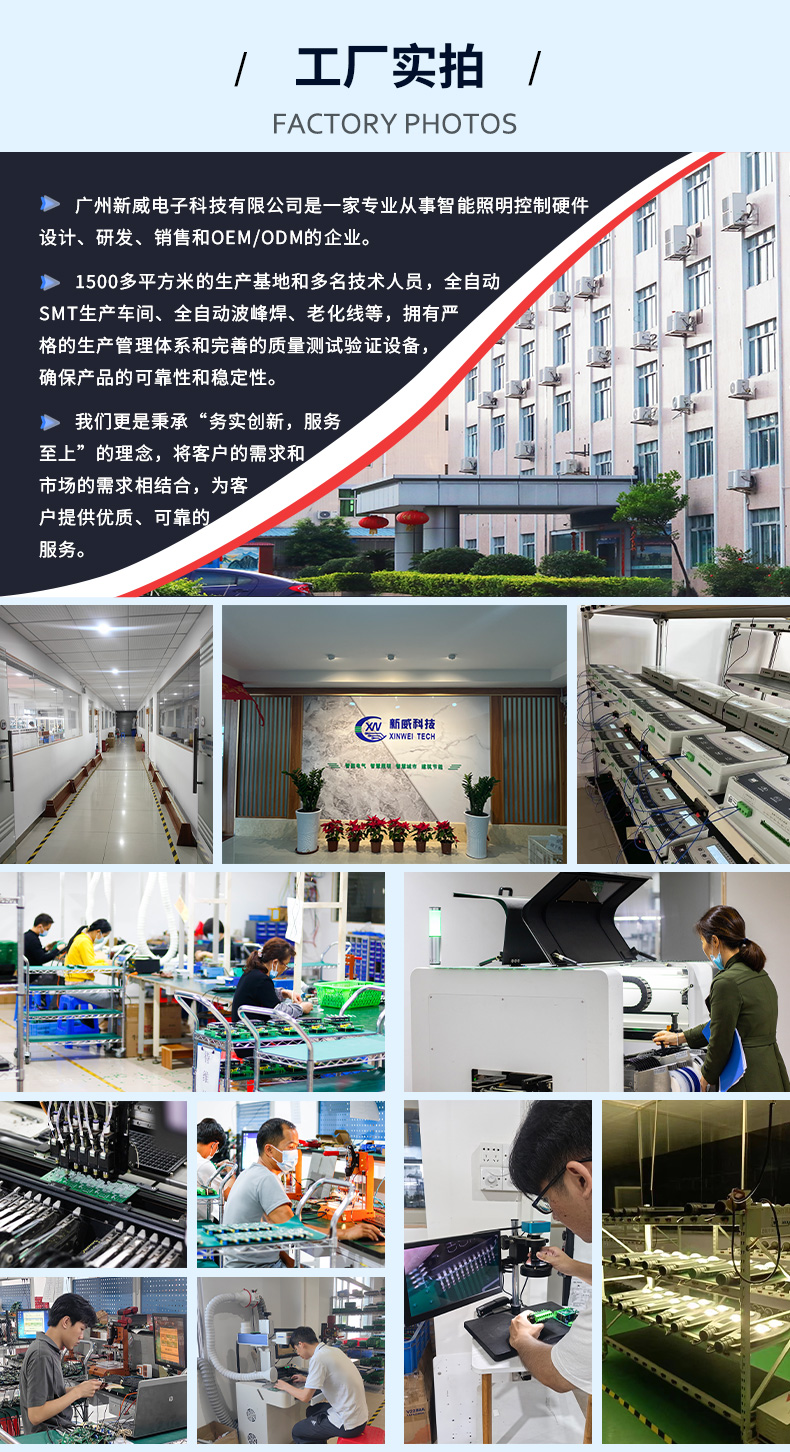 广州市新威电子科技有限公司成立于2012年2月14日,是一家专注于物联网智能照明控制系统产品的科研开发、生产和销售于一体的高新科技企业。产品应用在智慧路灯、景观亮化、港口码头、智慧园区、工厂仓库;以及室内公共区域智能化控制系统,包括商业综合体、楼宇建筑、轨道交通、地下车库、学校医院等各个领域。从公司成立至今11周年,在大家共同努力取得近几十项国家发明专利和实用新型专利、软件著作权等,以领先的技术、卓越的稳定性、良好的性价比、独特创新的产品结构、便捷的使用性赢得了客户的广泛认可和良好的口碑。