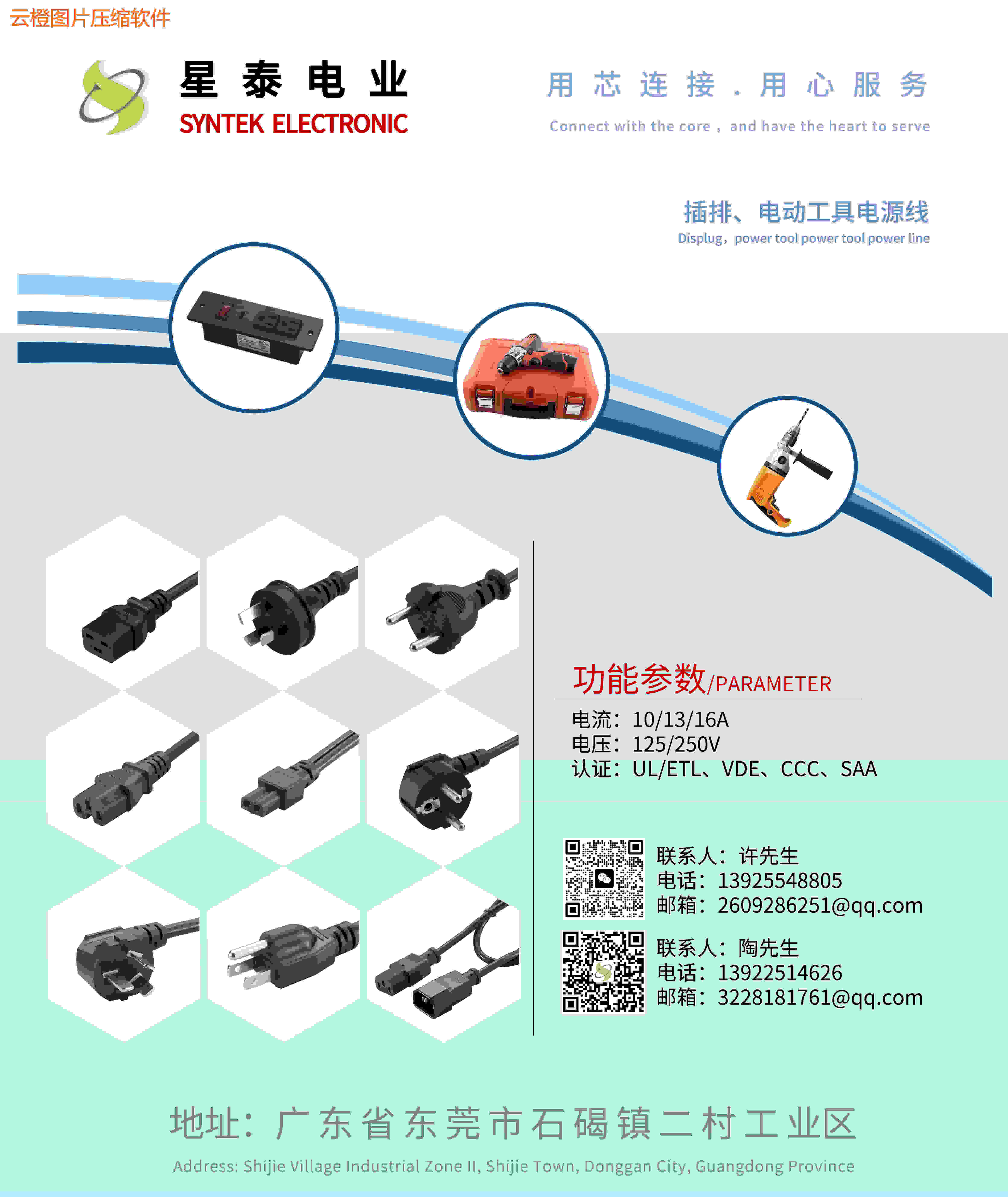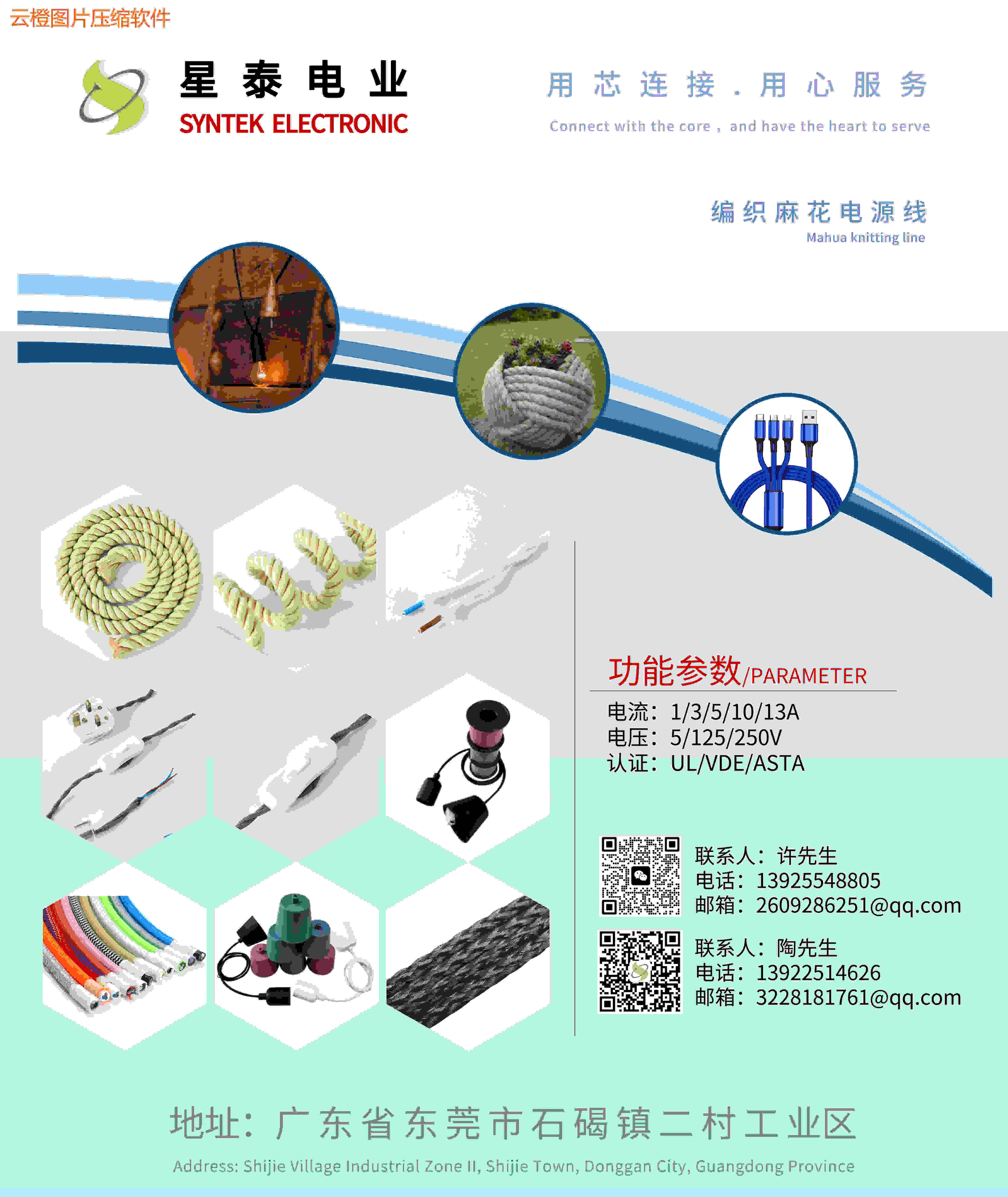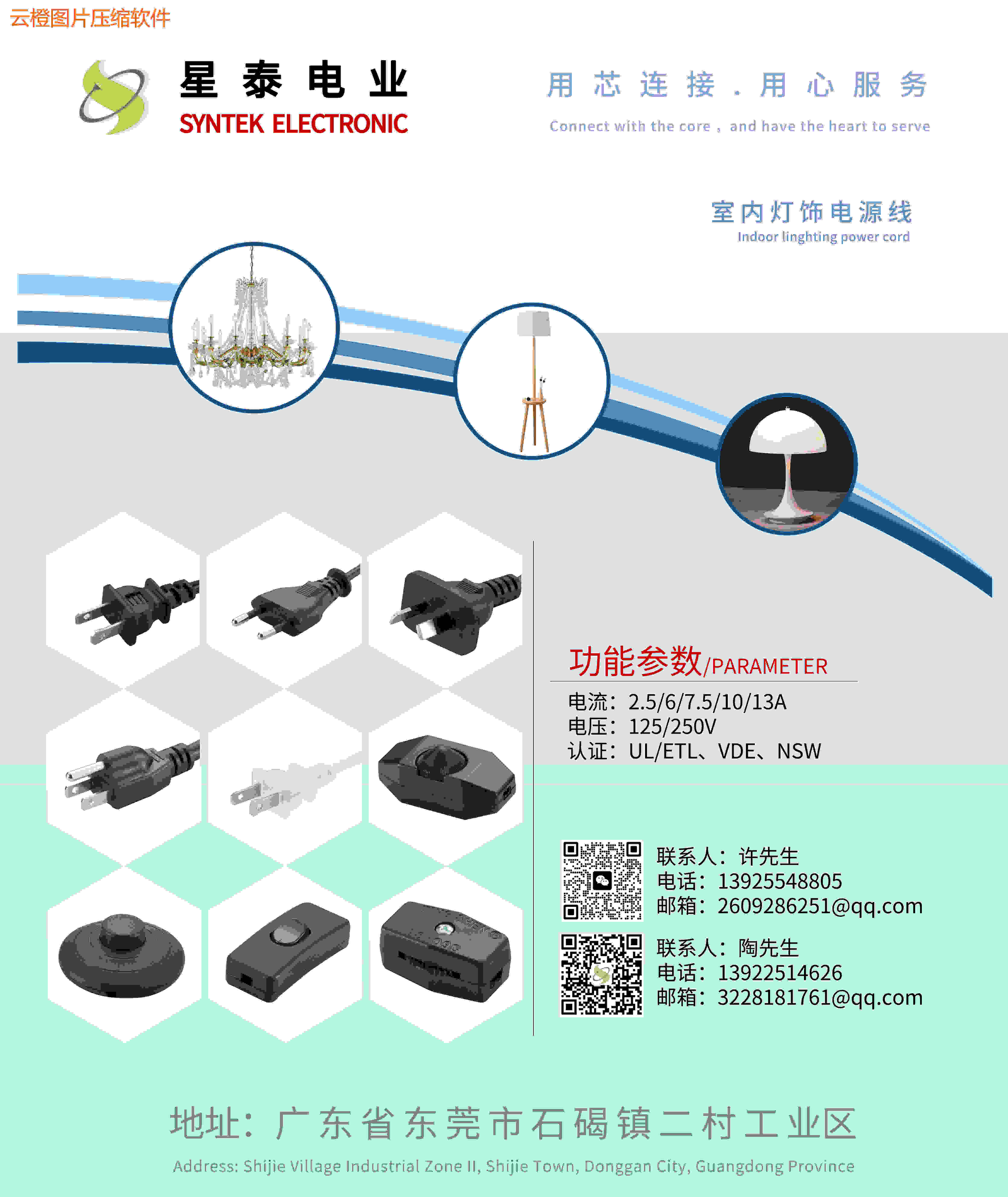 东莞市星泰电业有限公司是美规电源线、欧规电源线、国标电源线、澳规电源线、英规电源线等产品专业生产加工的公司,拥有完整、科学的质量管理体系。东莞市星泰电业有限公司的诚信、实力和产品质量获得业界的认可。欢迎各界朋友莅临参观、指导和业务洽谈。