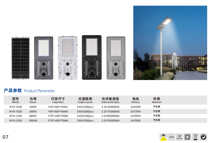 采用抗氧化外壳,硬度高,散热快 高品质太阳能板,弱光充电技术,光电转化率高 全新铁锂储能专用电池,雷达感应系统