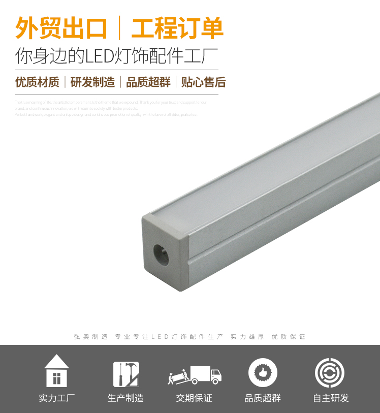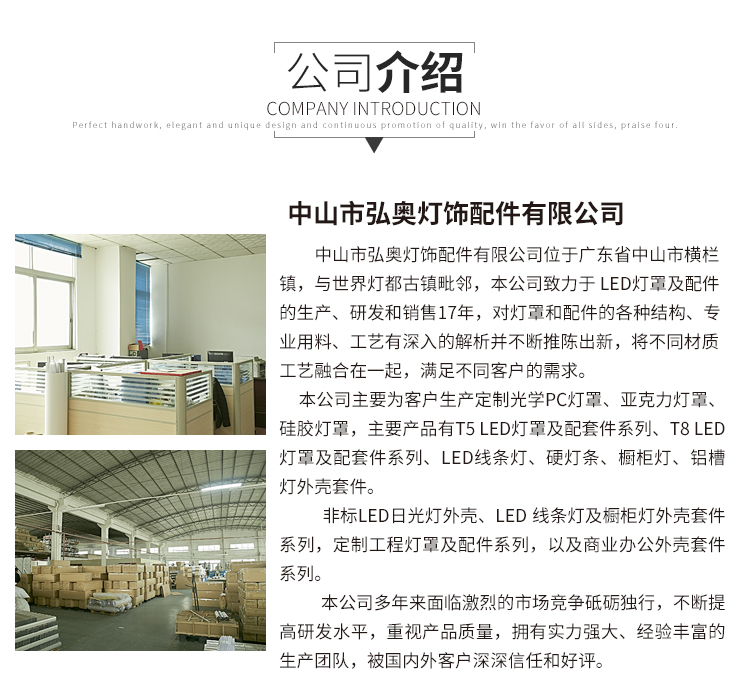 中山市弘奥灯饰配件有限公司是专注于配套外壳的生产型企业、PC灯罩生产、铝材加工生产、日光灯套件 线条灯外壳套件、硬灯条外壳套件、LED硅胶等产品专业生产加工的公司,拥有完整和科学的质量管理体系。