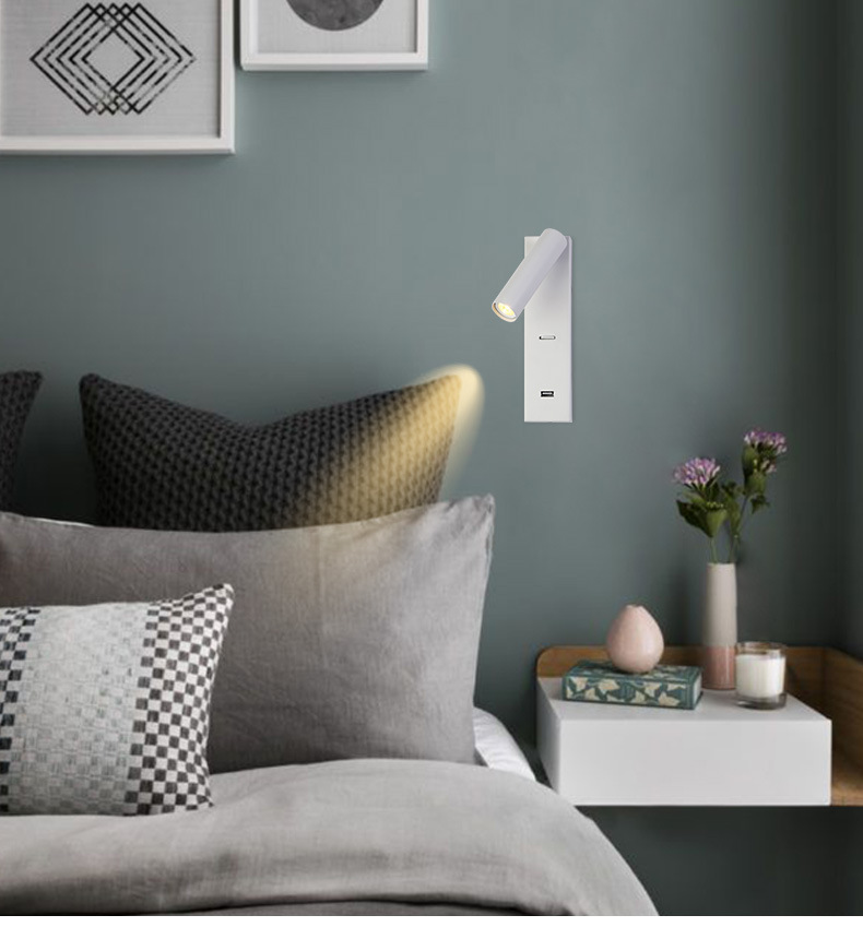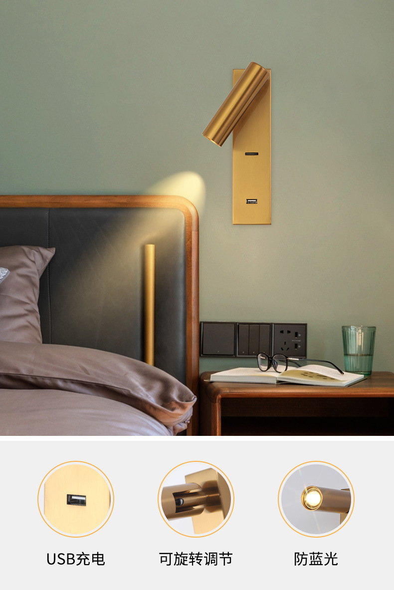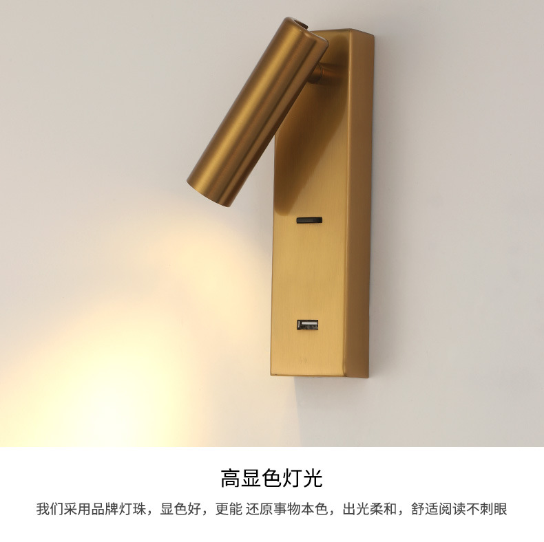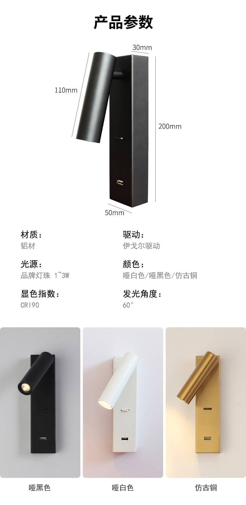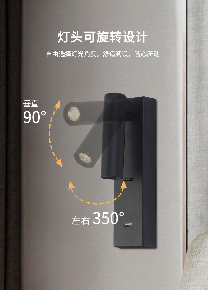 跨境简约酒店民宿样板房可旋转射灯卧室床头USB充电壁灯
